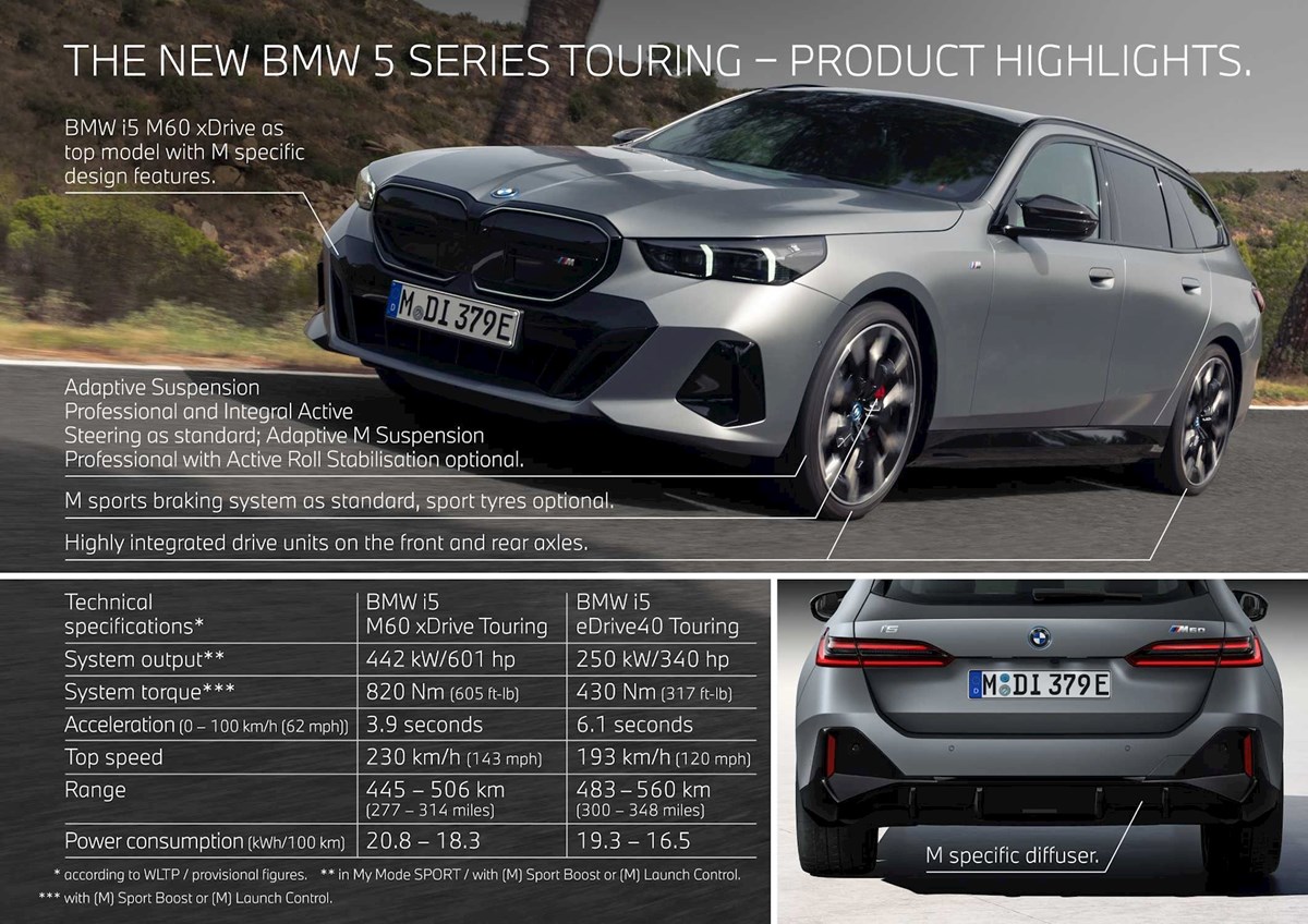 Električna opcija je već u izlogu. Model i5 eDrive40 Touring nudi se za 72.200 eura, a nudi 340 KS uz 560 km dosega. Snažniji i5 M60 xDrive Touring ima čak 601 KS i još uvijek nudi doseg preko 500 km (506 km po WLTP). Cijena mu se piše sa šest znamenki i kreće od 101.500 eura. I pripazite, ovaj je model prazan na dvije tone, a 100 km/h postiže za samo 3.9 sekundi.
