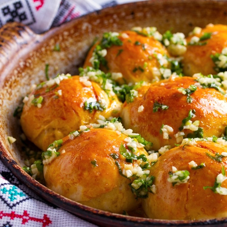 Pampushka je tipično ukrajinsko pecivo koje se najčešće poslužuje uz ukrajinsku juhu od cikle. To su zapravo male okrugle pogačice, obično mekane i pahuljaste, prelivene mirisnim češnjakom i začinskim biljem, najčešće sjeckanim peršinom. Cijeli recept za njih pronađite ovdje.