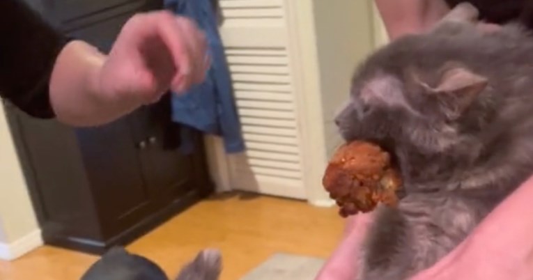 LJUBIMCI će sve učiniti da se dočepaju ljudske hrane. A kad jednom ukradu hranu s tanjura, nema šanse da to dobijete natrag. Dokaz je video koji je postao viralan na TikToku s 10 milijuna pregleda. Mačka se dočepala pilećeg bataka, a čak troje ljudi bilo je potrebno da joj ga se preotme. Pogledajte video.