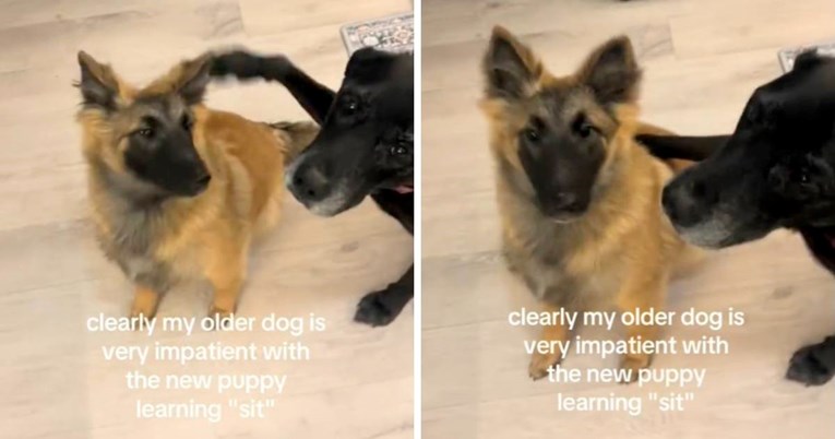 Na viralnoj snimci, objavljenoj na profilu @herpetellagist početkom siječnja, možemo čuti vlasnicu pasa kako belgijskom ovčaru govori da sjedne, no mladi pas odbija je poslušati. Stariji pas u tom trenutku odlučuje uzeti stvari u svoje šape i štene nježno gura na pod kako bi sjelo.