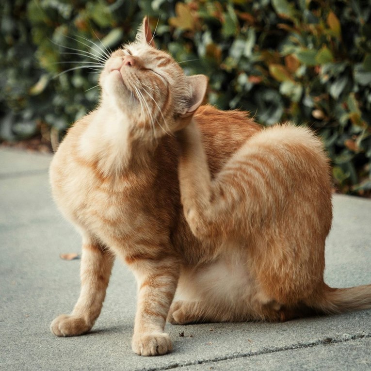 - Alergija na buhe: Najčešći oblik alergije kod mačaka. Reakcija preosjetljivosti na antigene prisutne u slini buha može uzrokovati intenzivan svrbež, osobito na području glave i vrata, te pojavu milijarnog dermatitisa – sitnih krastica po koži