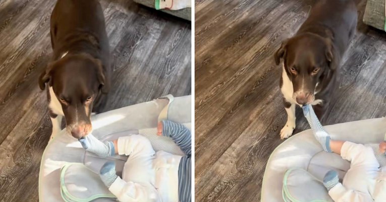Pritom se šuljao polako i tiho, kao da pokušava biti neprimjetan, ali teško je sakriti velikog psa koji "operira" tik uz bebu. Snimka je zabavna i slatka, a pas pleše na tankoj granici između nestašnog ponašanja i čiste ljubavi. Srećom, beba nije ni primijetila krađu čarape, pa je cijela situacija završila bez suza, i bez kazne za četveronožnog lopova. Pogledajte video.