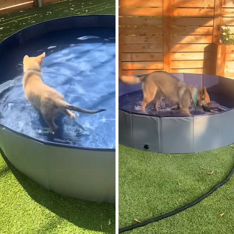 VLASNICI su njemačkim ovčarkama Riley i Popeye odlučili kupiti bazen kako bi se mogle rashladiti preko ljeta, a lijepe ovčarke su imale vrlo drugačije prve reakcije. Za razliku od slatke Riley koja je još uvijek štene, njezina odrasla prijateljica Popeye nije imala strah od bazena i vode.