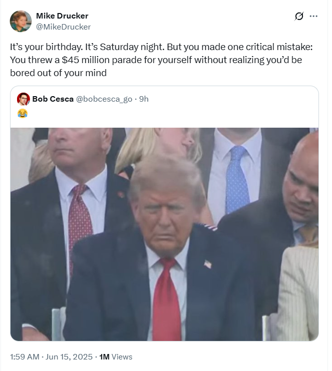 "Rođendan ti je. Subota je navečer. Ali napravio si jednu ključnu pogrešku: organizirao si paradu vrijednu 45 milijuna dolara za sebe, a nisi ni shvatio da će ti biti smrtno dosadno", piše uz viralni mem koji prikazuje Trumpa sa zatvorenim očima, a koji je već prikupio milijun pregleda.