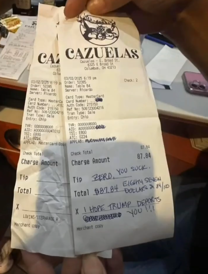 Na račun je napisala: "Nadam se da će te Trump deportirati!!!" U rubrici za napojnicu dodala je: "Nula, grozan si."