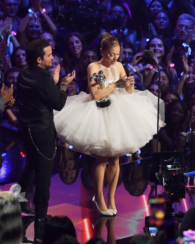 Za svoju posljednju pojavu večeri - kad je primila nagradu za Video godine - Ariana se odlučila za bijelu kreaciju inspiriranu baletnom suknjicom, s potpisom Givenchyja. Haljina je imala proziran gornji dio koji je otkrivao trbuh, dok je suknja od višeslojnog tila stvorila dojam lakoće i elegancije.