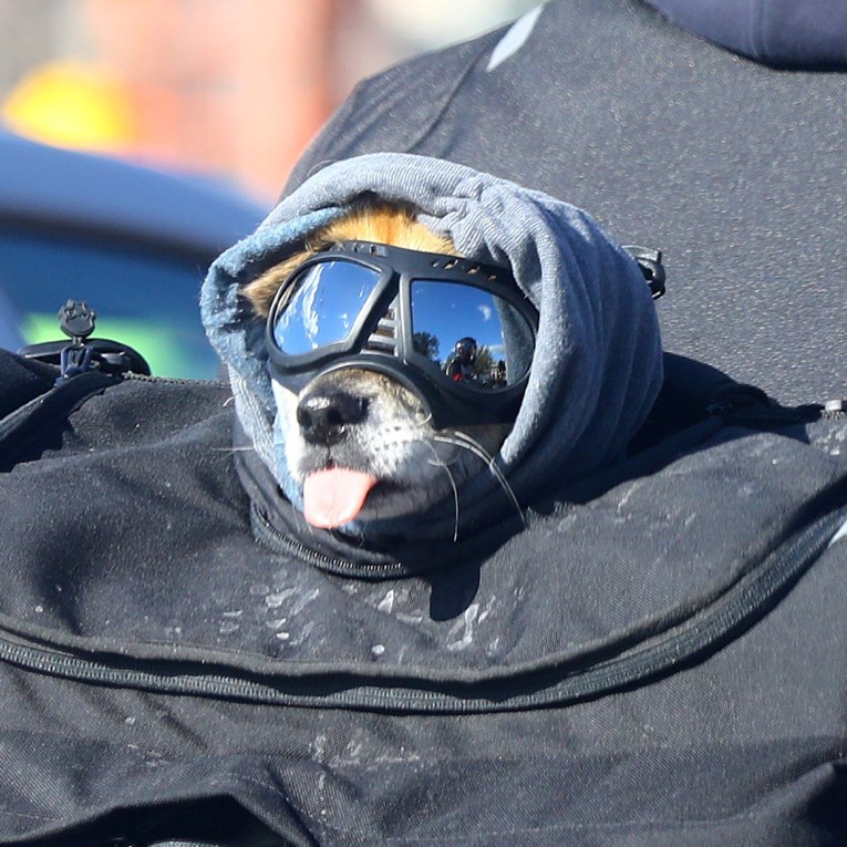 NA SPLITSKIM je ulicama jutros pažnju privukao jedan motorist koji je imao neobičnog suputnika - svog ljubimca. Psića je stavio iza sebe u torbu, glavu mu je zaštitio kapuljačom i naočalama, kako mu ne bi smetali sunce i vjetar, te se s njim zaputio u vožnju.
