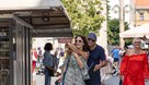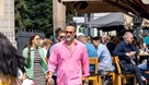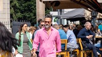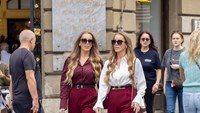 Kombinirala je košulju s puf rukavima i asimetrični top preko ravnih hlača, a cijeli look zaokružila platform sandalama, velikim sunčanim naočalama i upečatljivim rukavicama bez prstiju.