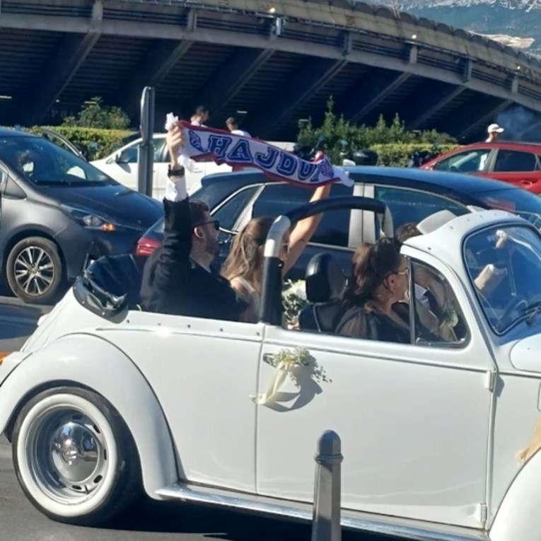 Naime, mladenci su se provozali ispred stadiona, a u rukama su držali zastavu Hajduka. Pogledajte video.