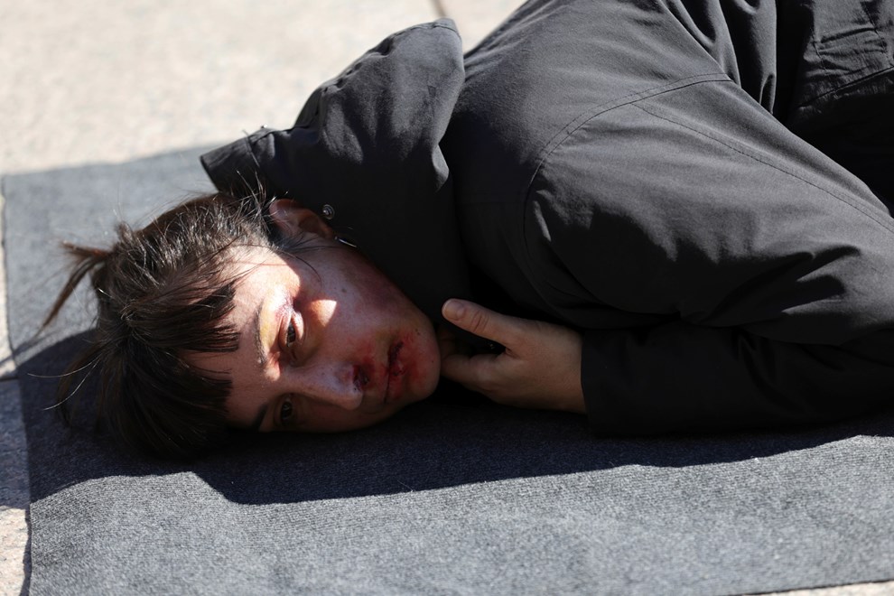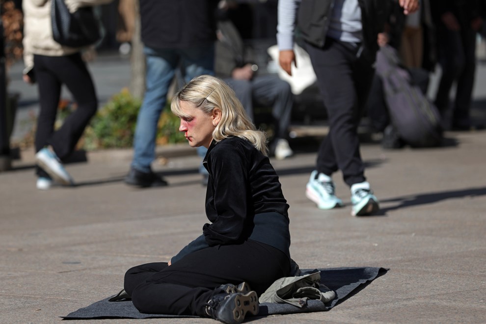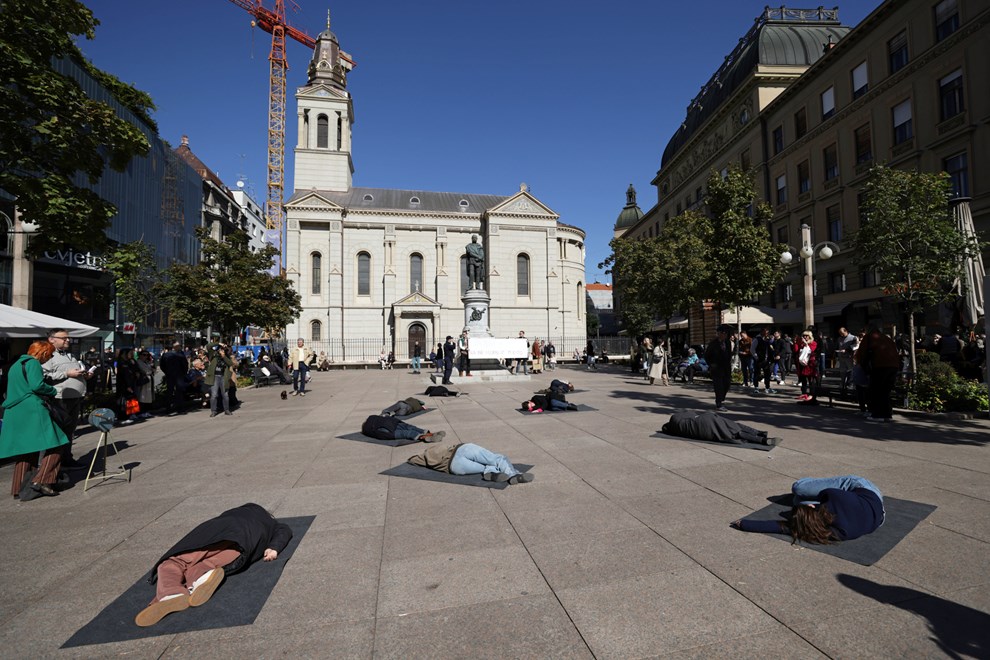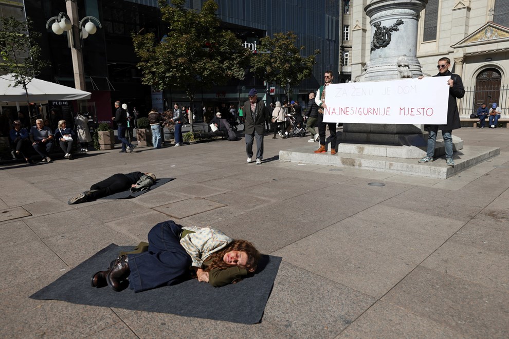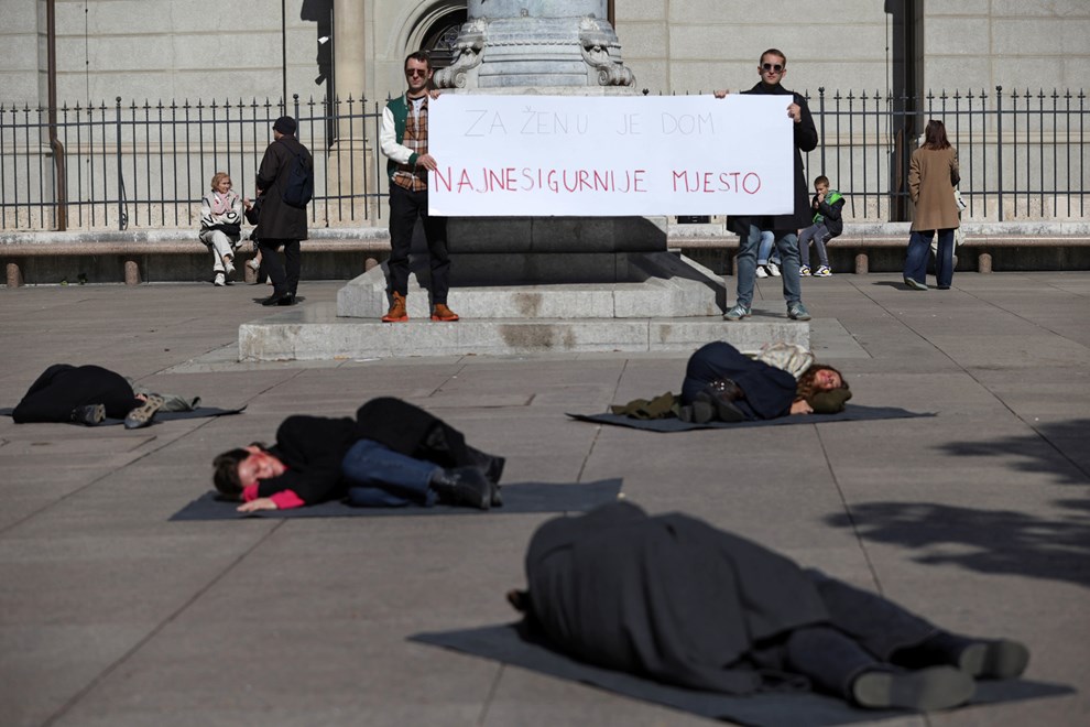 Na Cvjetnom trgu devet djevojaka prebijenih lica točno u podne sjelo je na crne podmetače te na zvuk sirene leglo na pod. Iznad njih dva su muškarca držala natpis “Za ženu je dom najnesigurnije mjesto". Nakon 10 minuta, na ponovni zvuk sirene, djevojke su se ustale i otišle.