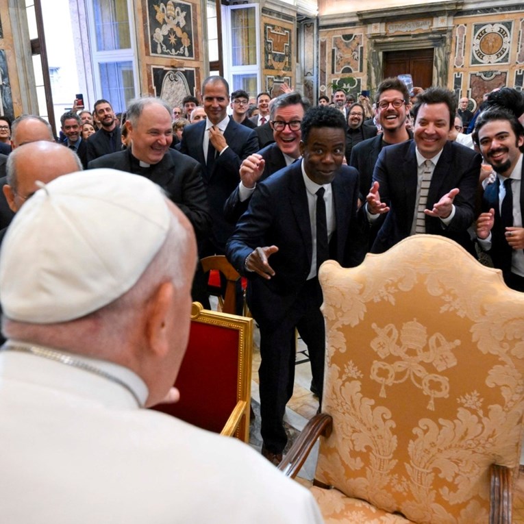 Među njima su bili Whoopi Goldberg, Stephen Colbert, Jimmy Fallon, Chris Rock, Conan O'Brien i Julia Louis-Dreyfus, a papa je tada nasmijao izjavom, rekavši da se "redovito moli da mu Bog da smisao za humor."