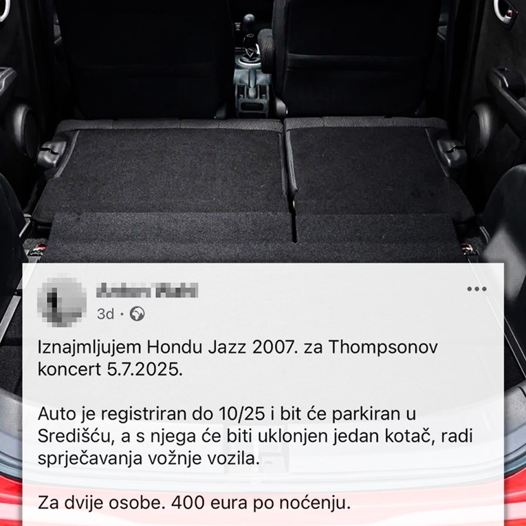 "Iznajmljujem Hondu Jazz 2007. za Thompsonov koncert 5.7.2025. Auto je registriran do 10/25 i bit će parkiran u Središću, a s njega će biti uklonjen jedan kotač, radi sprječavanja vožnje vozila", piše u oglasu.