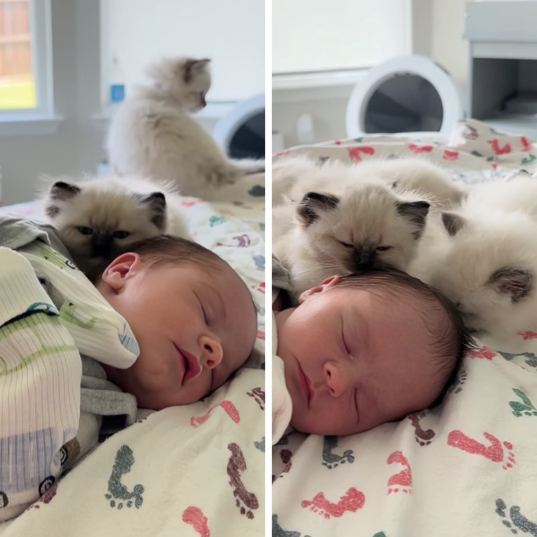MAMA Pearl Downing snimila je presladak trenutak u kojem su zajedno spavali njezina beba i mačići pasmine ragdoll. Videozapis koji je postao viralan na Instagramu prikazuje bebu koja spava i mačiće koji se nalaze oko nje, a posebno jednog koji se cijelo vrijeme mazio s bebom.