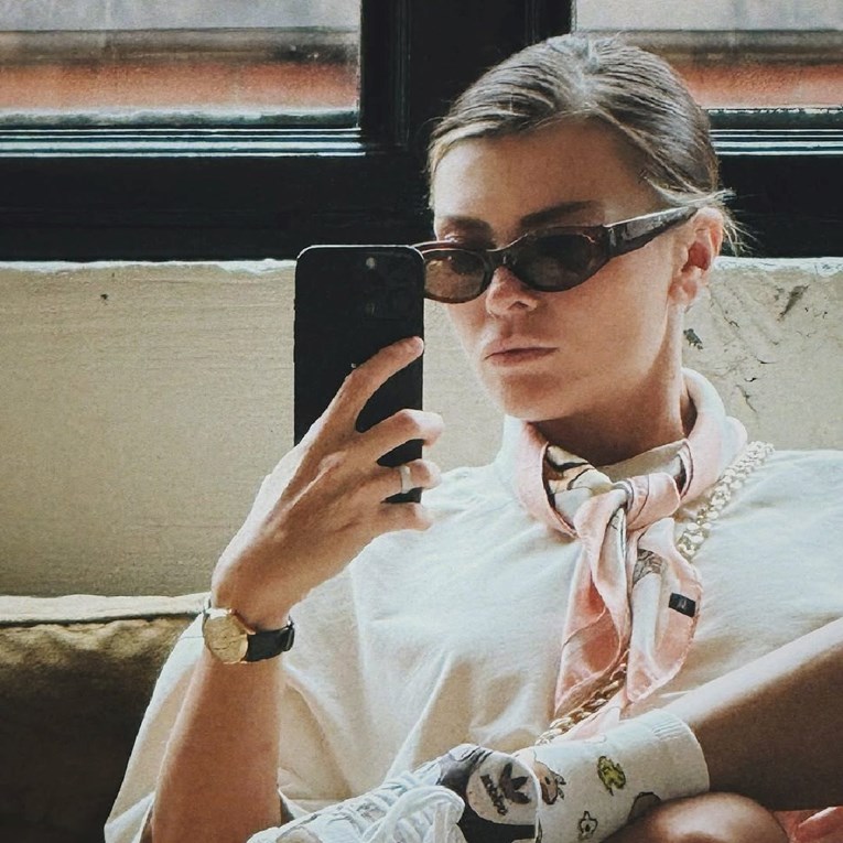 Na fotografijama nosi ležernu i trendi kombinaciju. Jednostavna bijela majica poslužila je kao baza koja ističe brojne modne detalje. Oko vrata nosi svilenkastu maramu u nježnim ružičastim tonovima s decentnim uzorkom, zavezanu u elegantan čvor. Na lijevoj ruci nosi minimalistički tanki sat i jednostavan prsten.