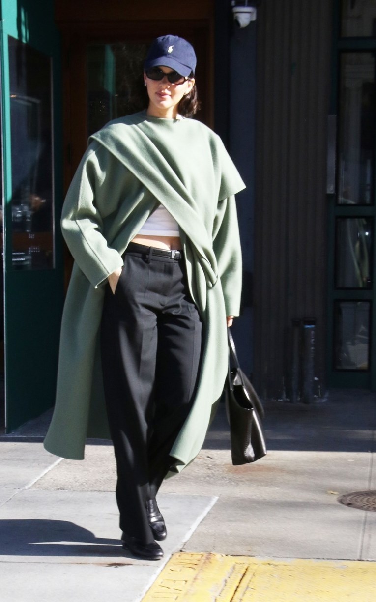 Kendall je svoju Ralph Lauren Polo šiltericu nosila u sklopu ležerne kombinacije s crnim hlačama, zanimljivim zelenim kardiganom, klasičnim bijelim topom, crnim mokasinkama i crnom torbom.