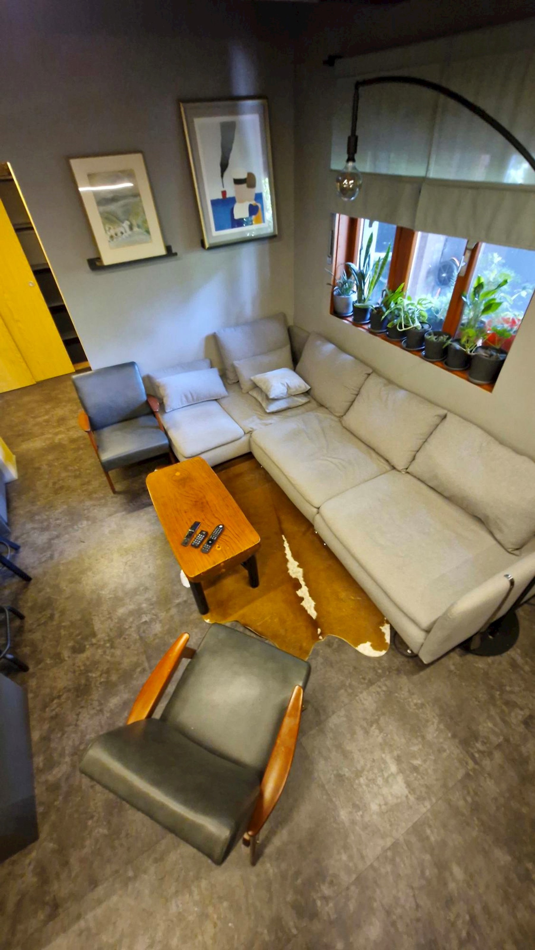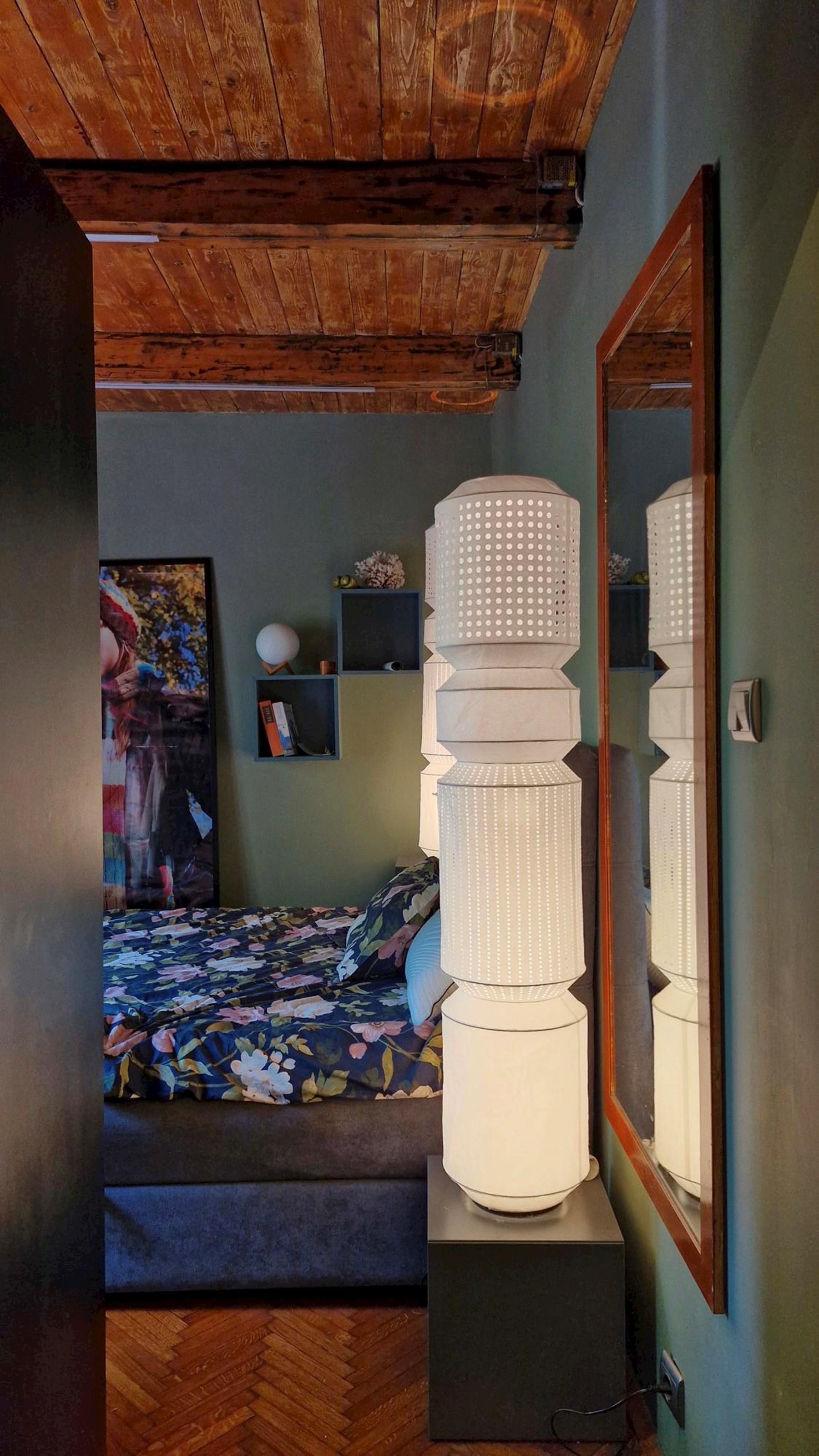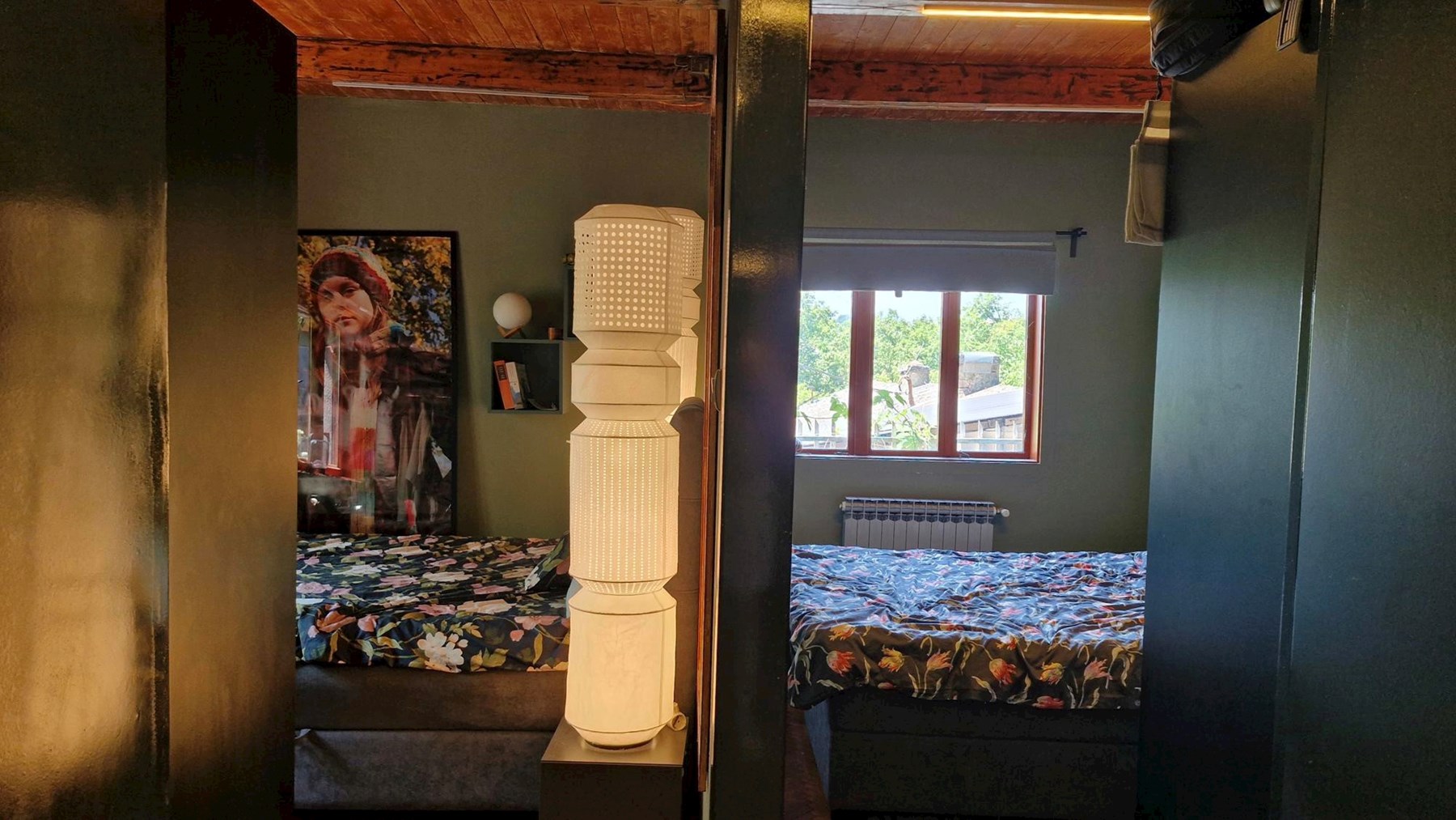 Stan na prvom katu prostire se na dvije etaže. Na prvoj se nalaze ulazni hodnik, prostrani dnevni boravak s blagovaonicom i kuhinjom, jedna spavaća soba, kupaonica, garderoba i terasa s pogledom na zelenilo. Druga etaža sastoji se od radnog pretprostora i dvije spavaće sobe, a otvoren prostor omogućuje pogled na donju etažu.