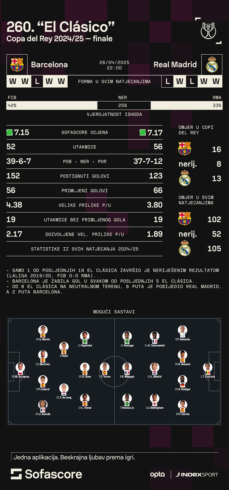 Današnja utakmica bit će prvi susret Reala i Barcelone u ovom natjecanju nakon nešto više od dvije godine. Ove dvije momčadi igrale su polufinale natjecanja 2023. godine, a iako je Barcelona slavila u prvom susretu (1:0), Real je u uzvratu u gostima deklasirao Katalonce s 4.0 i prošao u finale. Junak tog susreta bio je Karim Benzema, koji je zabio hat-trick.