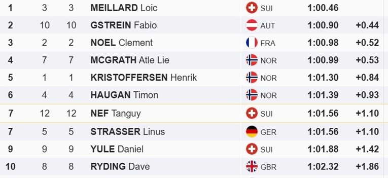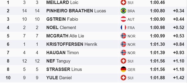 Austrijski skijaš Fabio Gstrein najviše se približio vodećem Meillardu. Zakasnio je za njim 0.42 sekundu i izgurao Noela na treće mjesto.