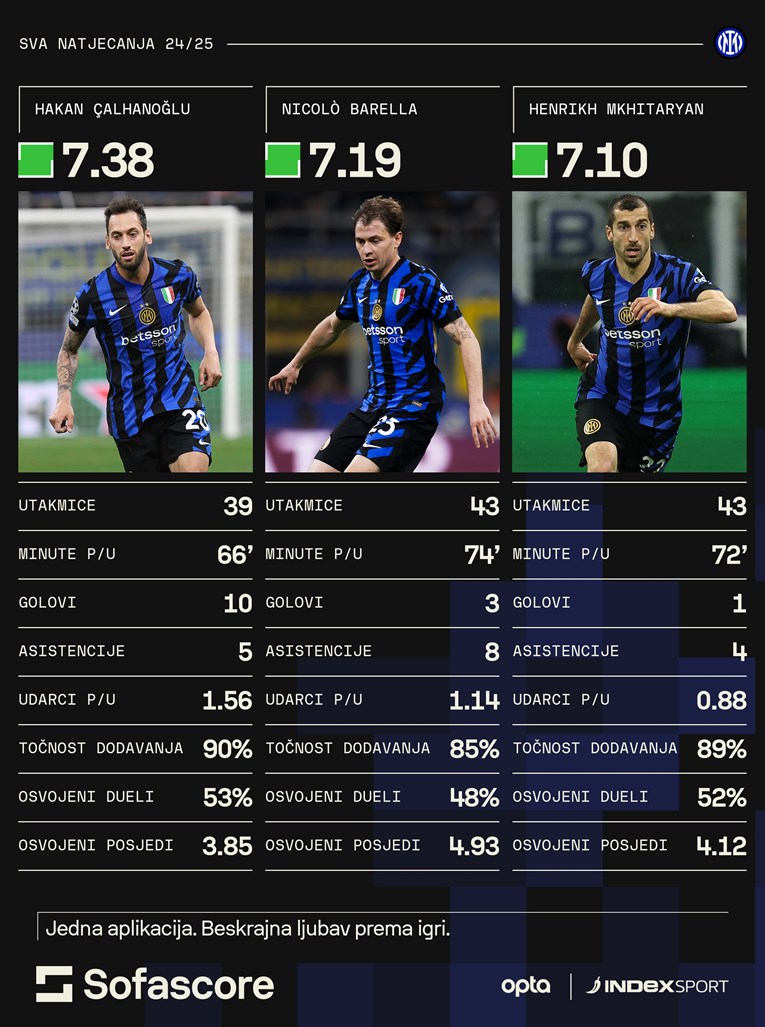 Unatoč tome, od Intera su u dodavanjima samo tri ekipe progresivnije: Bayern, Barcelona i Real Madrid. Razlog tome je što Inter u sredini terena u formaciji 3-5-2 igra s tri izuzetno jaka igrača na lopti. To su Nicolo Barella, Hakan Calhanoglu i Henrikh Mkhitaryan.