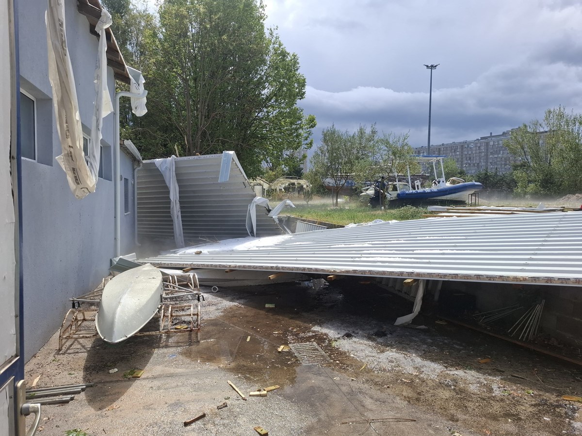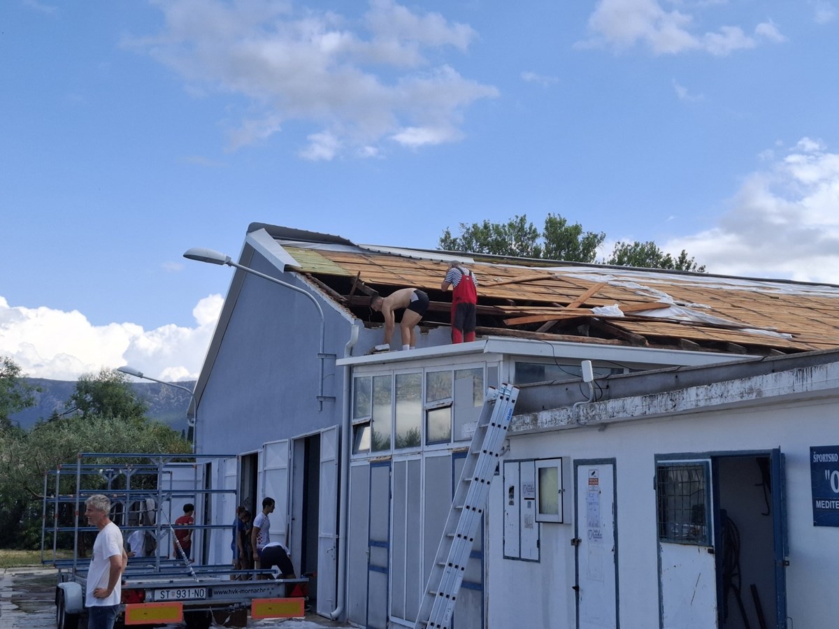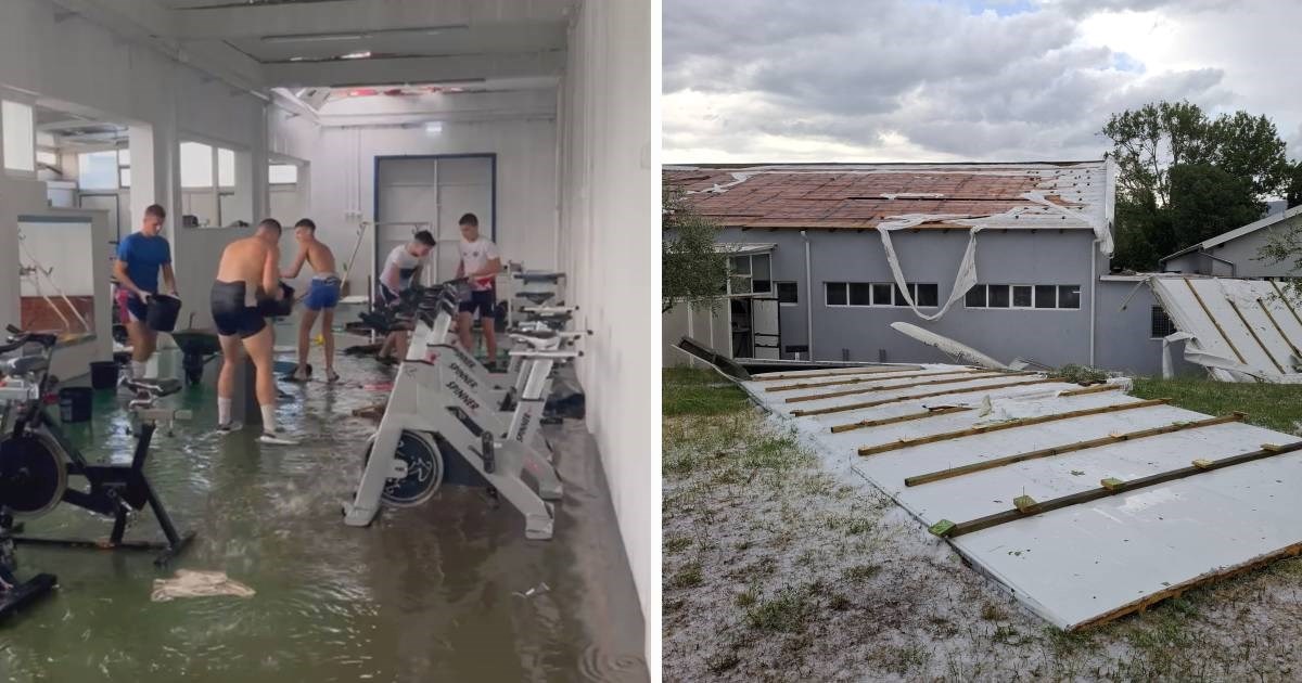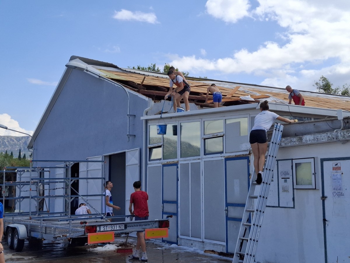 Mladići kantama izbacuju vodu. Ovo su posljedice nevremena u Veslačkom klubu Mornar