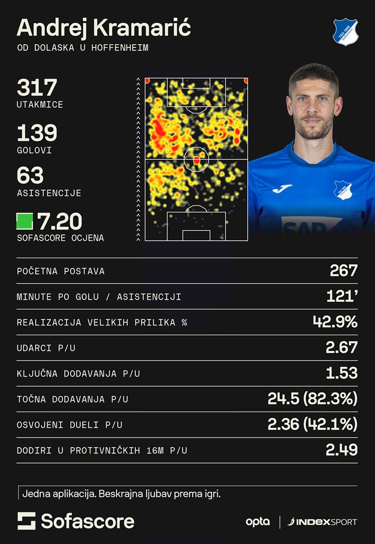 ANDREJ KRAMARIĆ stigao je u Hoffenheim u siječnju 2016. Bio je tad igrač Leicestera, koji je bivšeg ofenzivca Dinama i Rijeke doveo u transferu vrijednom 9 milijuna eura, što je tad bio rekord kluba. Kramarić u engleskom klubu nije uspio izboriti mjesto u prvoj postavi i prihvatio je posudbu, a kasnije i potpisao ugovor s klubom iz Bundeslige. Danas njemački mediji o njemu pišu kao o legendi i ikoni Hoffenheima.