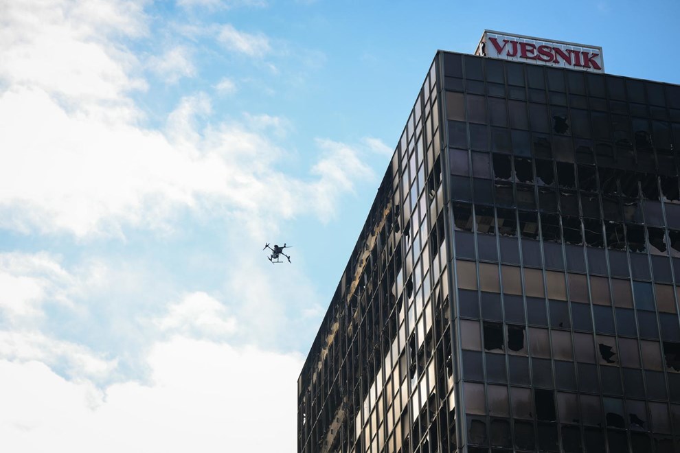 FOTOGRAFI su jutros snimili dronove kako kruže oko Vjesnika. Radi se o dronovima koji snimaju stanje kako je i najavio neki dan statičar Mario Uroš koji je davao izjave novinarima ispred Vjesnika.