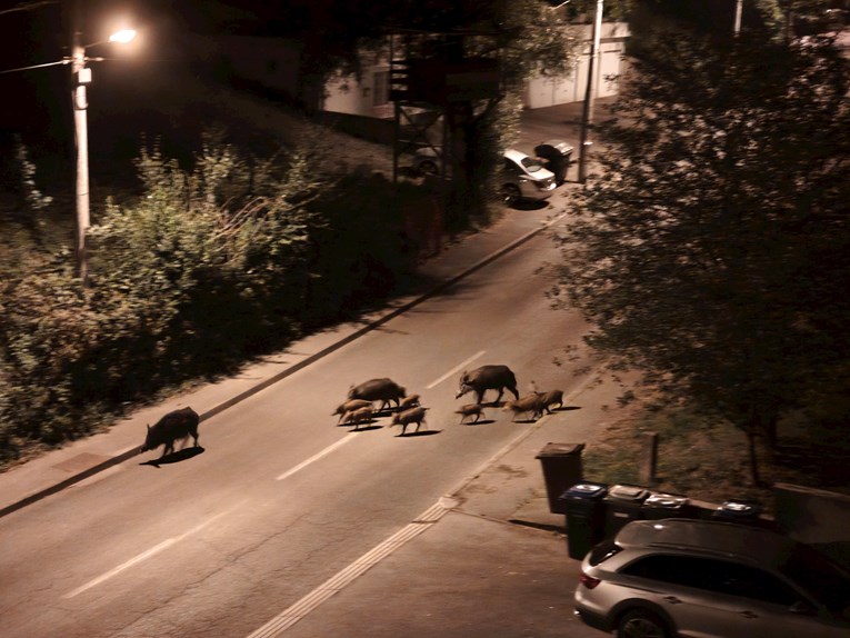 Poveću "obitelj" divljih svinja (a s obzirom na broj, možda i bližu rodbinu) snimio je u ulici Šestinski dol kod kućnog broja 140B, oko 23:45 sati.