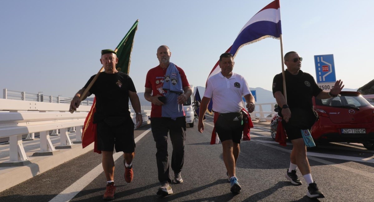 VETERANI iz Varaždina, koji su prepješačili tisuću kilometara od Vukovarskog vodotornja do Pelješkog mosta, prvi su danas prešli preko mosta.