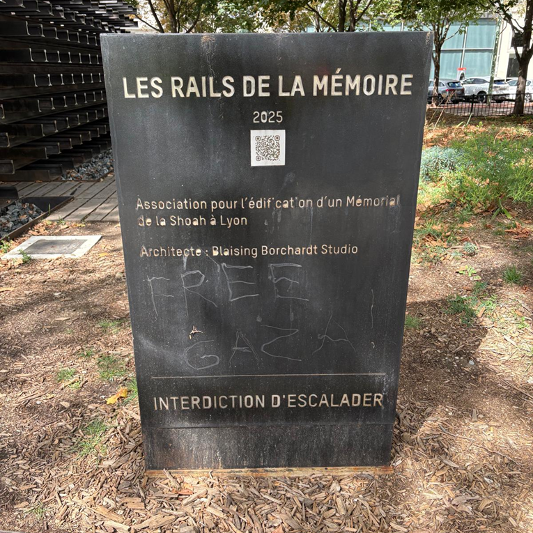 Na crnom mramornom spomen-stupu urezane su riječi "Slobodna Gaza", prema fotografiji koju je na društvenim mrežama podijelio Yonathan Arfi, predsjednik CRIF-a, krovne organizacije židovskih institucija u Francuskoj.