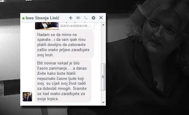 "NADAM se da mirno ne spavate. I da vam ipak nisu platili dovoljno da zaboravite zašto ovako prljavo zarađujete svoj kruh", poruka je koju je Mostova saborska zastupnica Ines Strenja Linić napisala novinarki Dubrovačkog dnevnika nakon što je na navedenom portalu objavljen članak s naslovom "Mostovci moraliziraju o presudama, a Strenja Linić osuđena zbog smrti djeteta u prometnoj".
