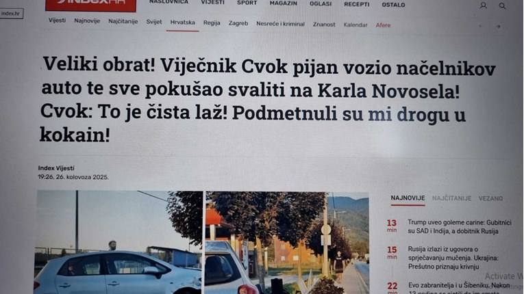 DRUŠTVENIM mrežama širi se lažna fotografija Indexovog clanka s naslovom: "Veliki obrat! Viječnik Cvok pijan vozio načelnikov auto te sve pokušao svaliti na Karla Novosela! Cvok: To je čista laž! Podmetnuli su mi drogu u kokain".