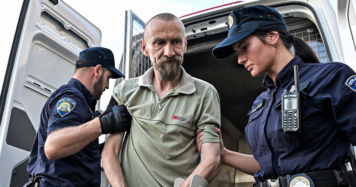 Vodilo ga je dvoje policajaca. Kretao se uz pomoć štake, a na rukama je imao lisice.