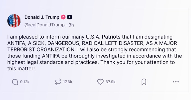 PREDSJEDNIK SAD-a Donald Trump je najavio nove mjere protiv ljevičarskih skupina nakon ubojstva desničarskog političkog aktivista Charlieja Kirka, usmjerivši se na antifašistički pokret Antifa koji je nazvao "terorističkom organizacijom".