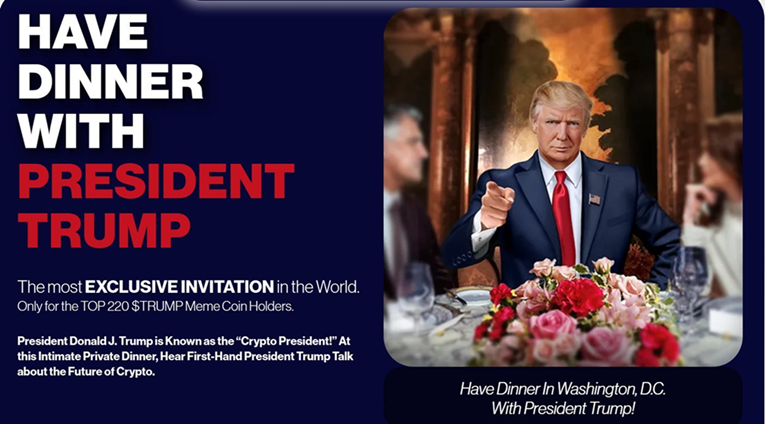 AMERIČKI predsjednik Donald Trump ponudio je "najekskluzivniju pozivnicu na svijetu", kako ju je sam opisao i to za privatnu večeru s njim osobno za 220 najvećih ulagača u njegovu kriptovalutu $TRUMP.