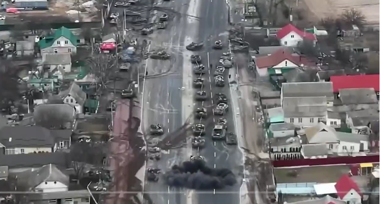 Kolona ruskih vojnih vozila u Kijevskoj oblasti na početku rata protezala se oko 55 kilometara. Kolona je u početku percipirana kao ozbiljna prijetnja Kijevu, ali se zaustavila. Vojni analitičari smatraju da je uzrok zaustavljanja bio nedostatak goriva i hrane, a problem su predstavljali i ukrajinski udari na kolonu.