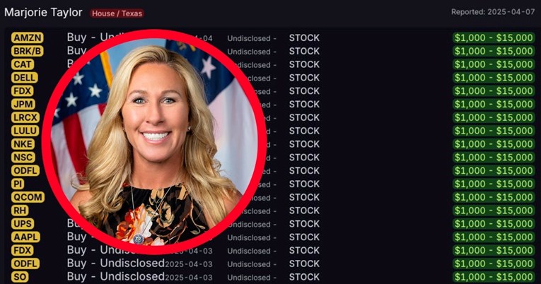 AMERIČKA kongresnica Marjorie Taylor Greene, republikanka iz Georgije, kupila je dionice u vrijednosti između 21.000 i 315.000 dolara 8. i 9. travnja, dan prije i na dan kada je predsjednik Donald Trump najavio pauziranje globalnih carina, što je izazvalo nagli skok burze, pokazuju službeni podaci.