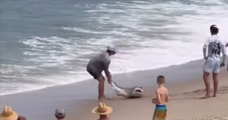 Pojavila se snimka na kojoj se vidi kako mlađi muškarac, kojem pomažu još dva muškarca, morskog psa vuče za rep plažom. Nakon što je pustio morskog psa u moru, muškarac je počeo šepati i tražio je pomoć.