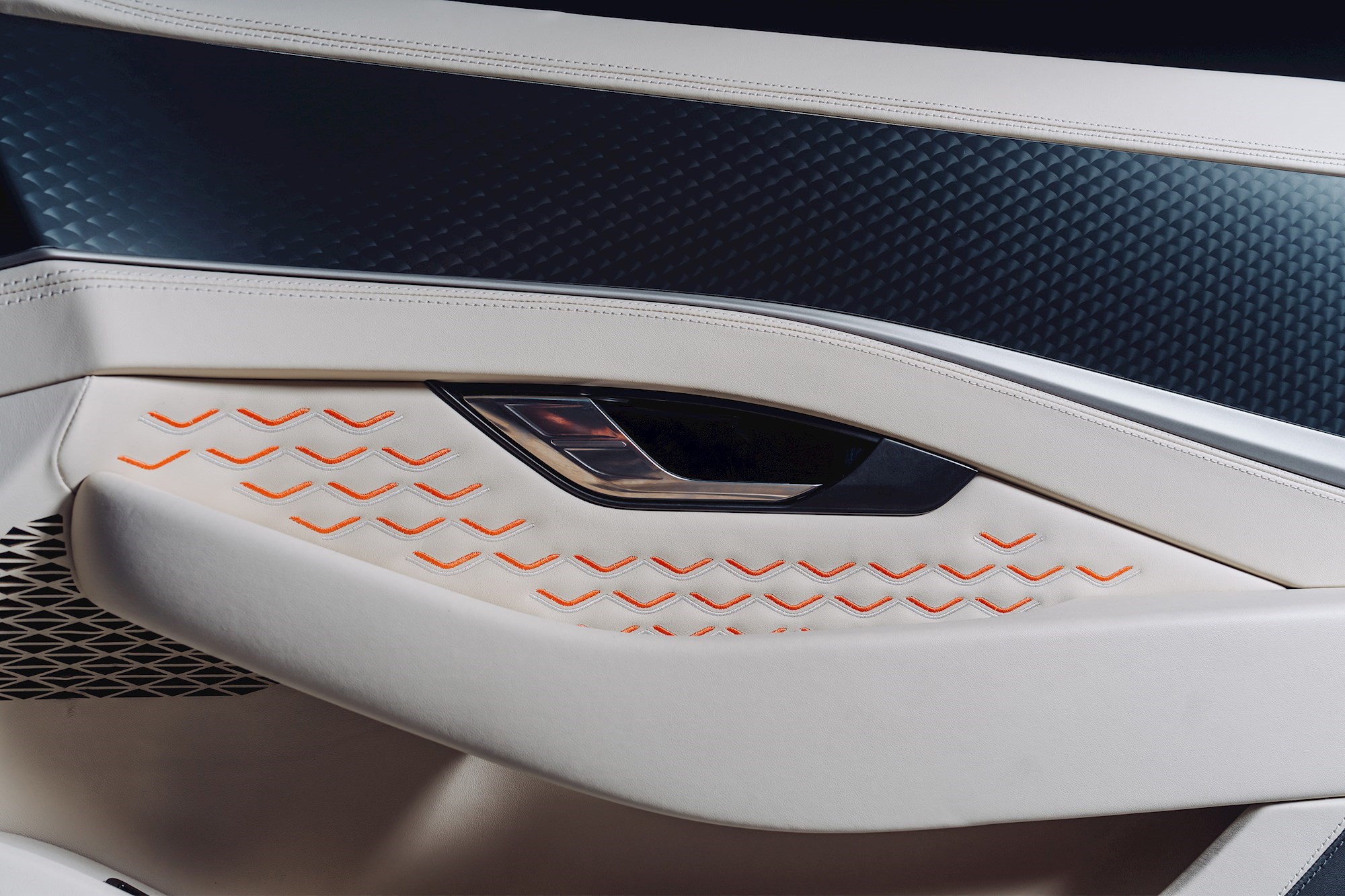 Suvozačka strana pruža potpuno drugačiji doživljaj. Sjedalo je u svijetloj Linen koži i alcantari s narančastim naglascima, dok se isti uzorak preslikava na panele vrata. Čak su i pojasevi, futrole za ključeve te prtljažni prostor izvedeni u dvobojnoj kombinaciji koja jasno razlikuje dvije strane automobila.