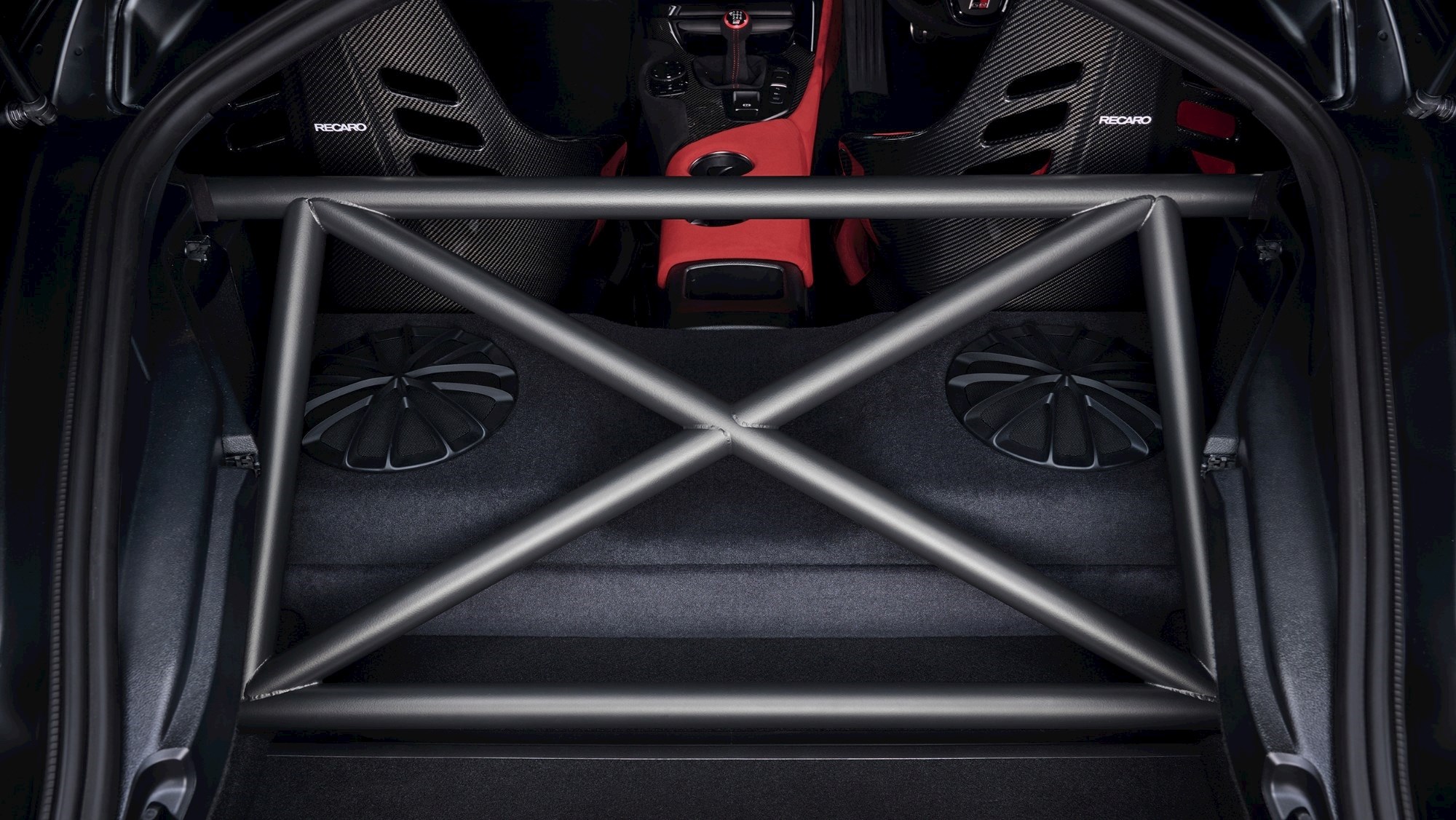 Pogled u unutrašnjost otkriva pravu ideju automobila - užitak angažirane sportske vožnje. Recaro Podium CF sportska sjedala s crvenim Alcantara umetkom pružaju savršenu potporu pri brzim prolascima kroz zavoje. Crveni sigurnosni pojasevi, karbonski detalji i Alcantara jasno daju do znanja da se radi o posebnom, limitiranom modelu.