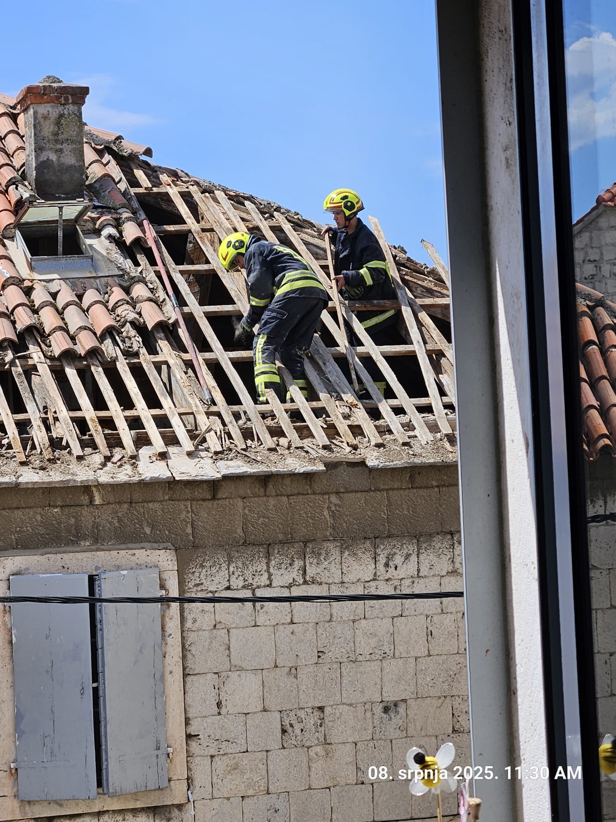 Vatrogasci DVD-a Vranjic cijeli su dan na terenu i bez prestanka pomažu mještanima sanirati krovove postavljajući cerade kako bi bili zaštićeni za prvo vrijeme.
