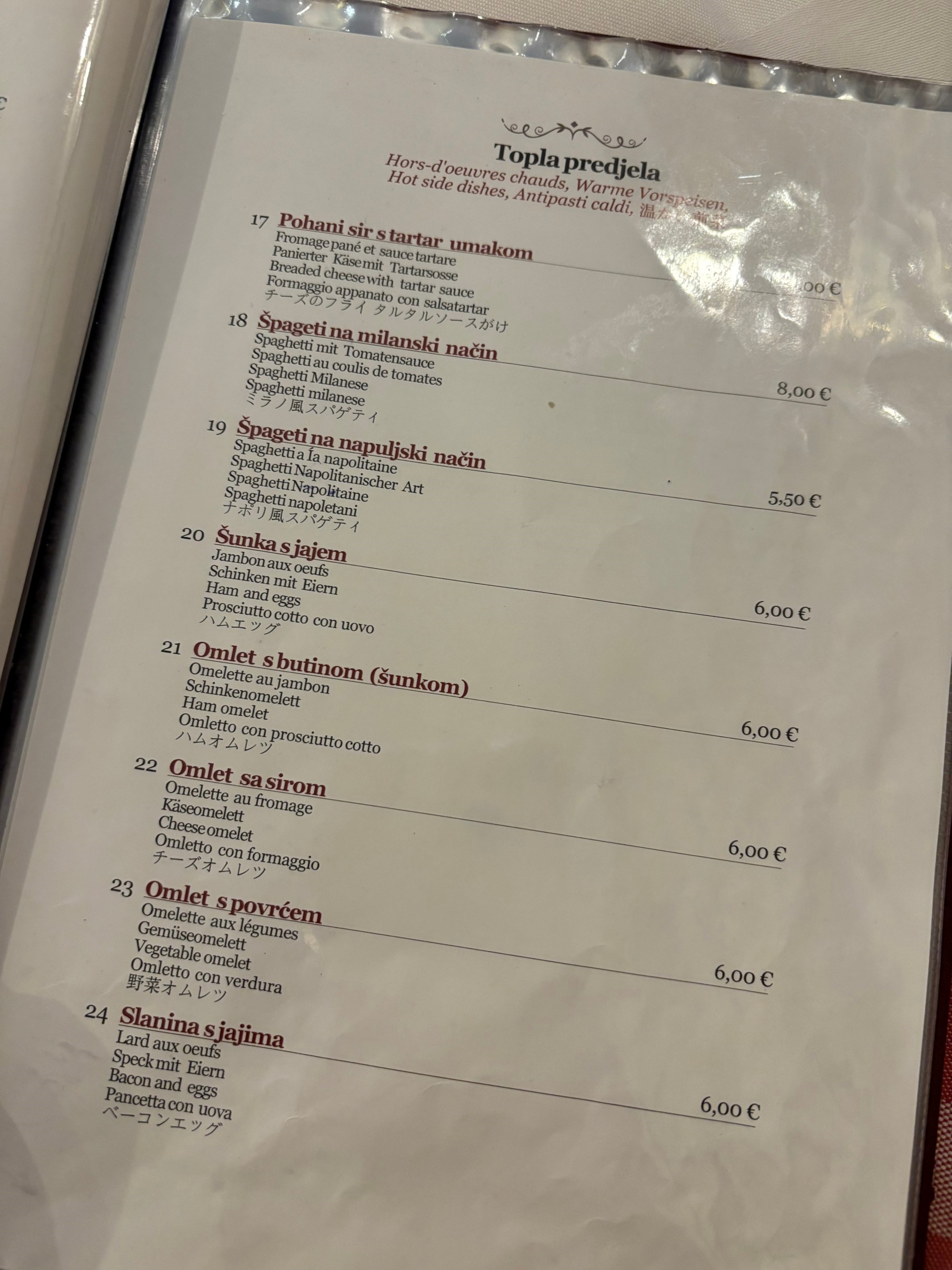 Glavni fokus jelovnika su gotova jela s prilogom: teleći paprikaš s pire krumpirom za 13 eura, fileki sa slaninom 10 eura, vinski gulaš 9 eura, grah sa suhim mesom 13 eura, punjene paprike i sarma po 13 eura. Tu su i kosani odrezak s varivom za 13 eura, domaće pečenice i krvavice po 16 eura, dok se klasična kuhana teletina s pireom i povrćem te teleće pečenje nude po cijeni od 18 eura. Ista cijena vrijedi i za patku s ražnja s mlincima.