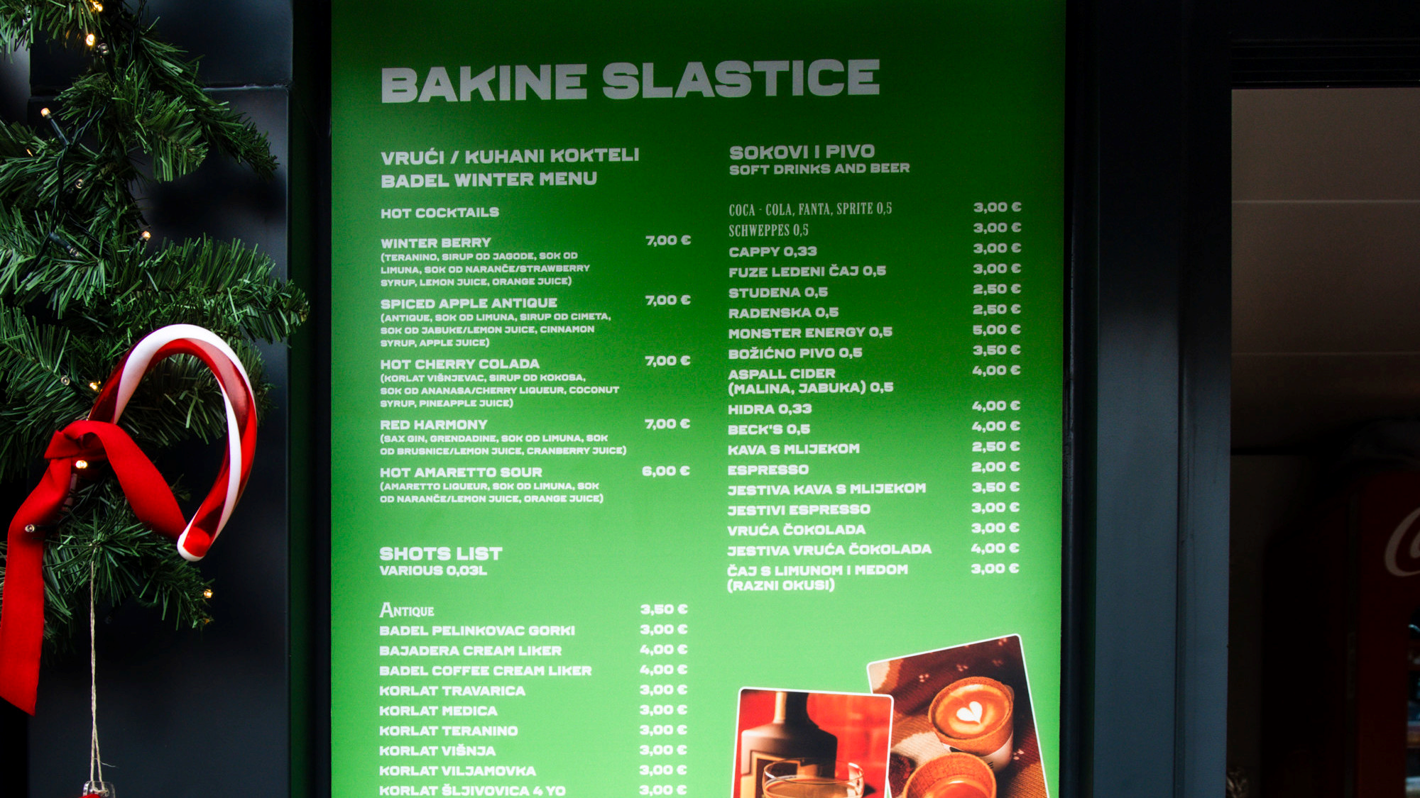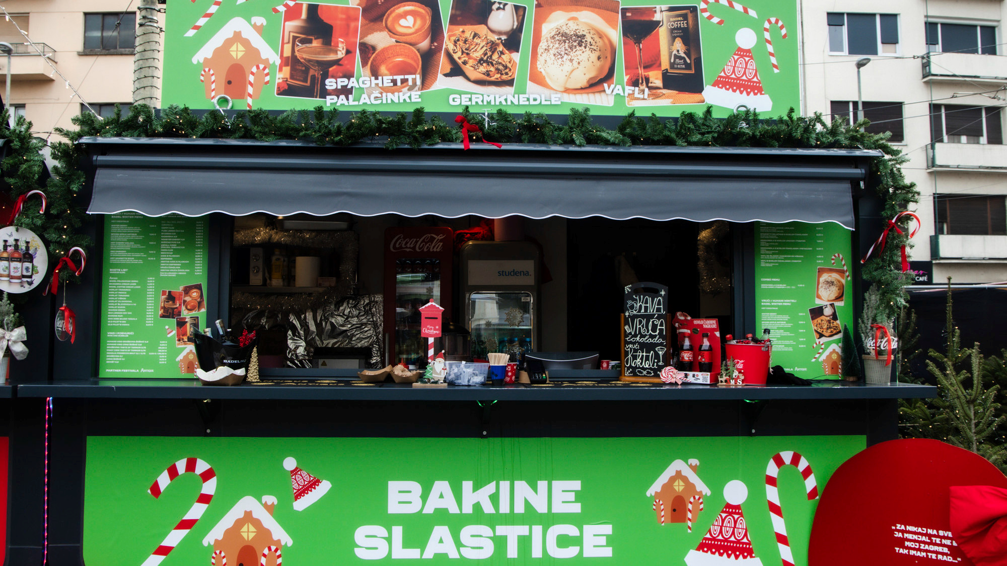 Tu su i spaghetti palačinke s Linoladom za 5 eura te s bijelom čokoladom za 6 eura, ali i vafli sa šlagom i nadjevom od višanja za 4.50 eura te s bijelom čokoladom i posipom od pistacija za 6.50 eura, a nakon deserata, možete se ugrijati kuhanim koktelima koji su na ovoj kućici nešto drugačiji nego na drugima, s cijene su im iste - između 6 i 7 eura.