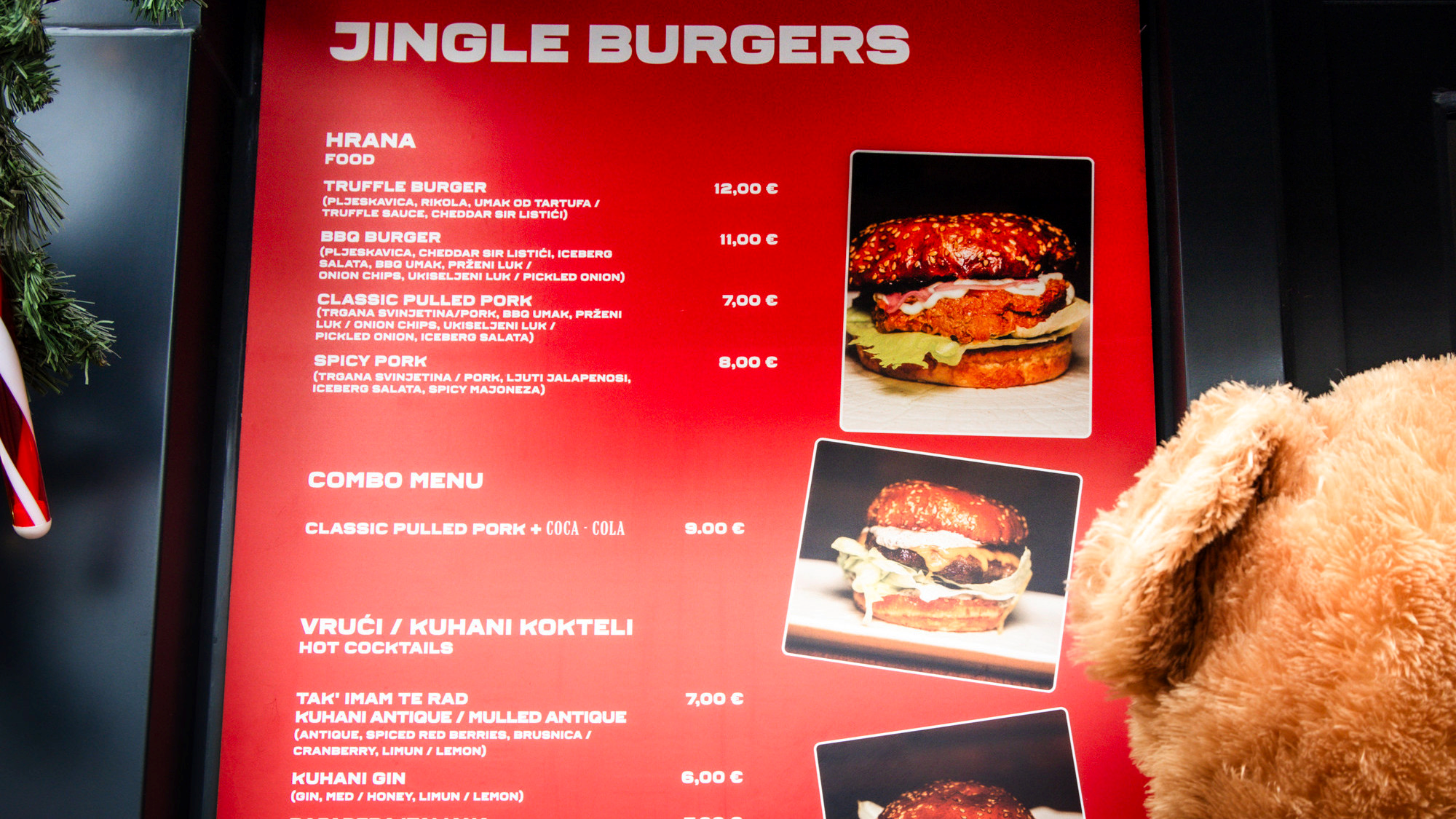 Jinglingz nudi ponešto i za ljubitelje burgera na kućici Jingle Burgers. Ovdje možete odabrati jedan od njihovih 4 burgera - Classic Pulled Pork s trganom svinjetinom i BBQ umakom za 7 eura, Spicy Pork s trganom svinjetinom i spicy majonezom za 8 eura, BBQ Burger za 11 eura te Truffle Burger s umakom od tartufa za 12 eura.