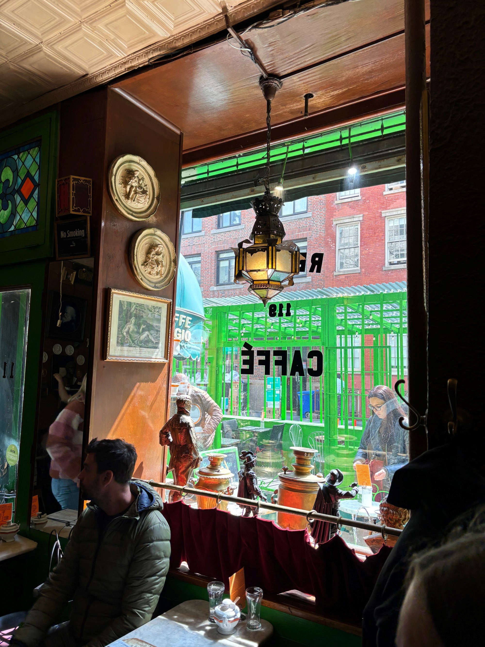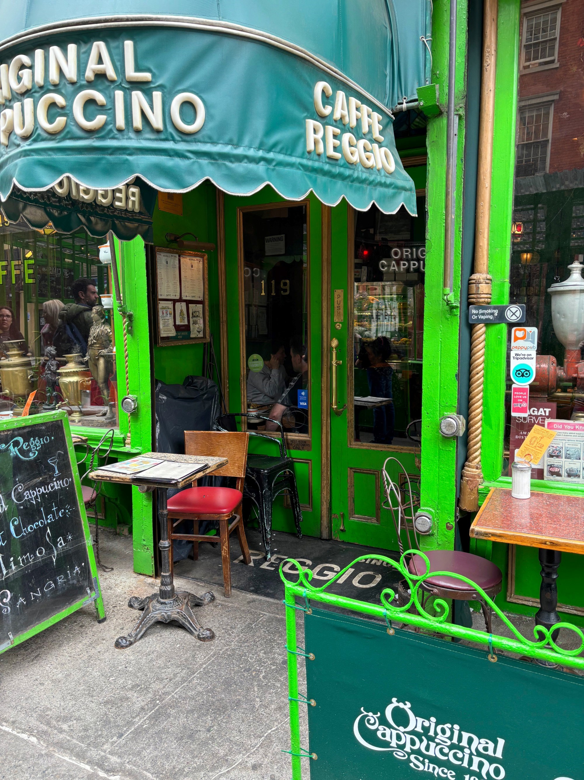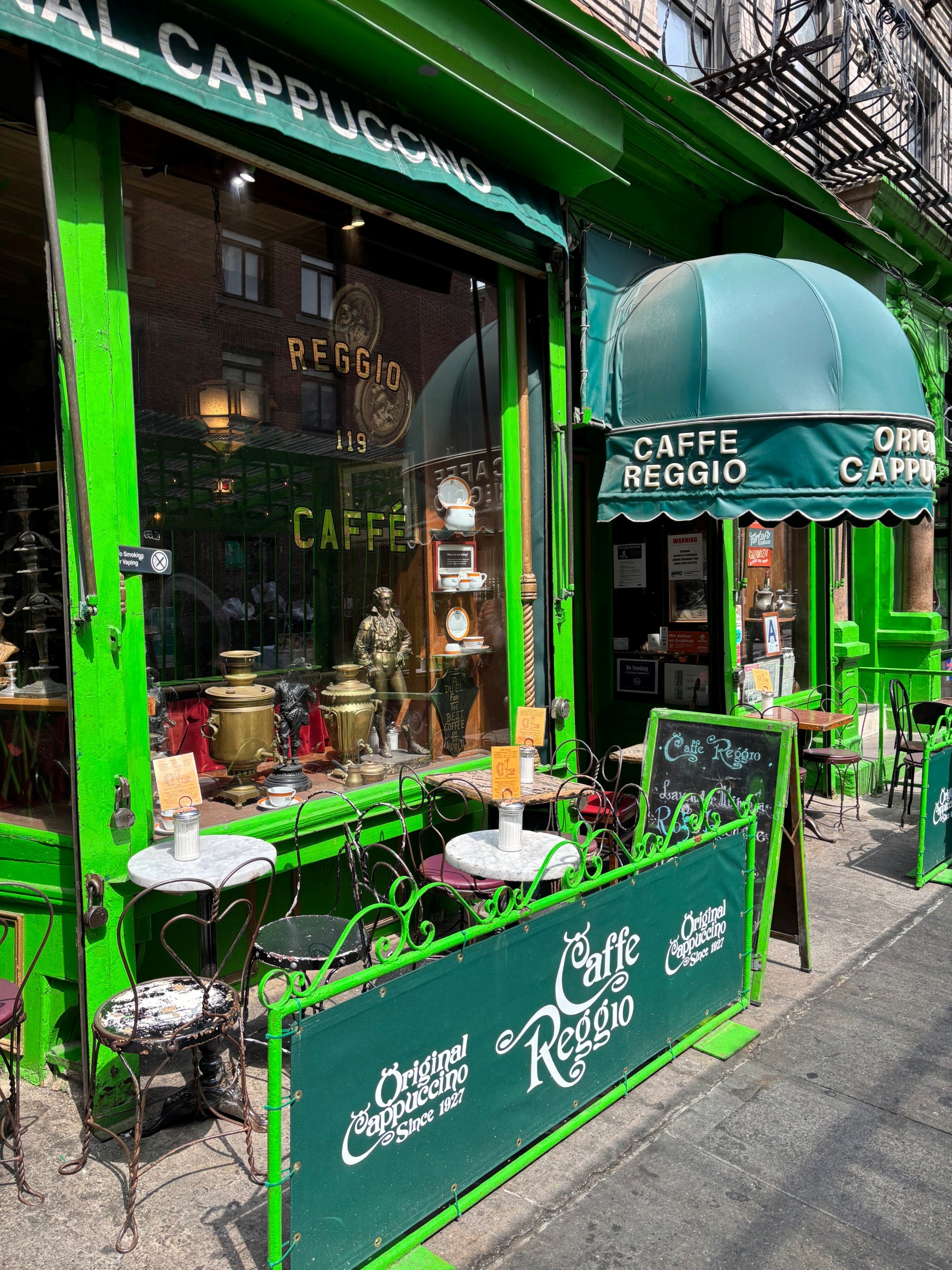 Vratimo se na Caffe Reggio, koji u šetnji ovim dijelom Greenwich Villagea zaista ne možete ne primijetiti - pročelje je jarko zeleno, pomalo teatralno, a izlog pun prašnjavnih antikviteta koji djeluju kao da nisu taknuti barem jedno desetljeće. Otvoren je 1927. godine, a zbog zelene boje, na prvu je lako zamijeniti ga i za kakav rustikalni irski pub.