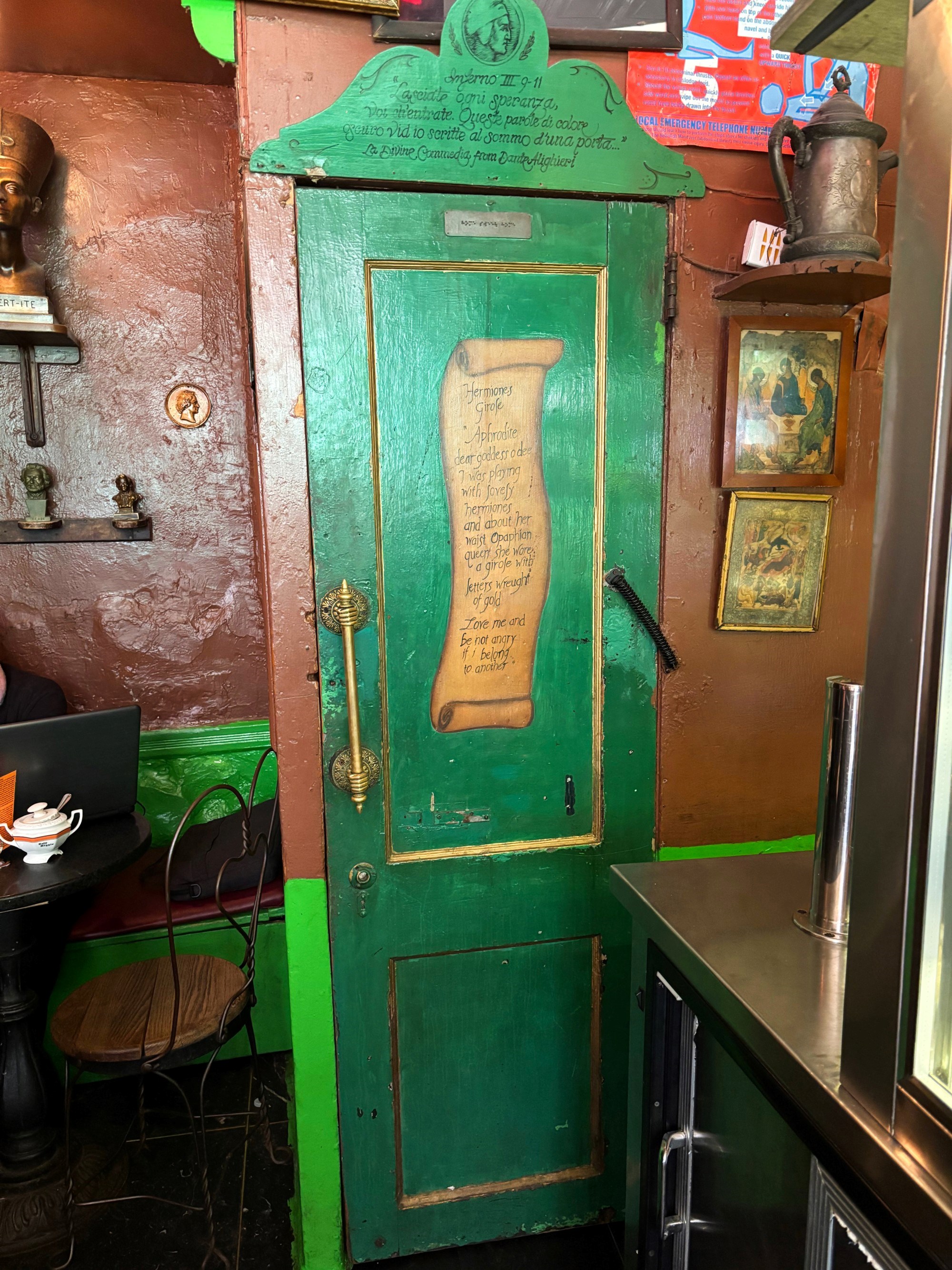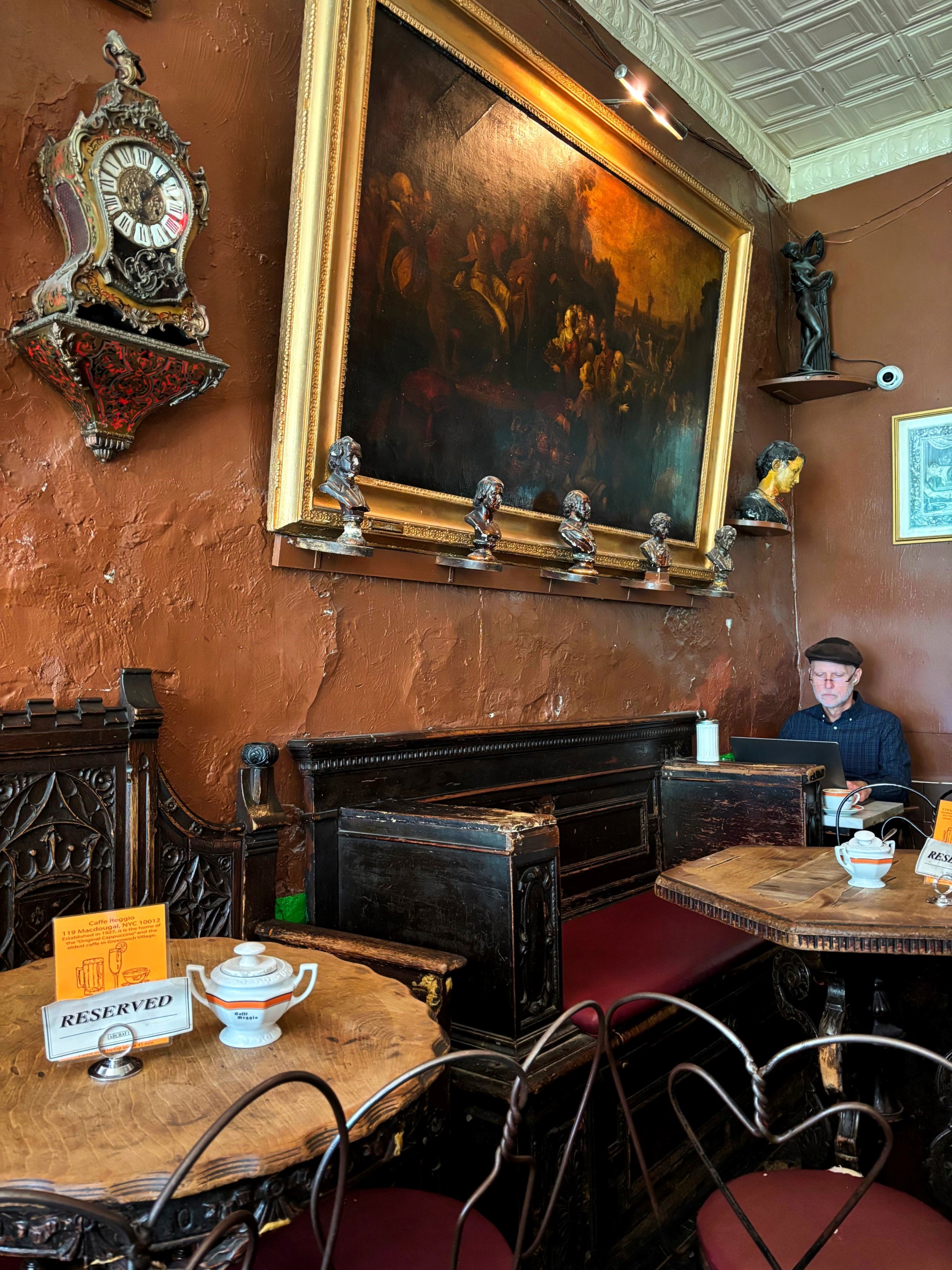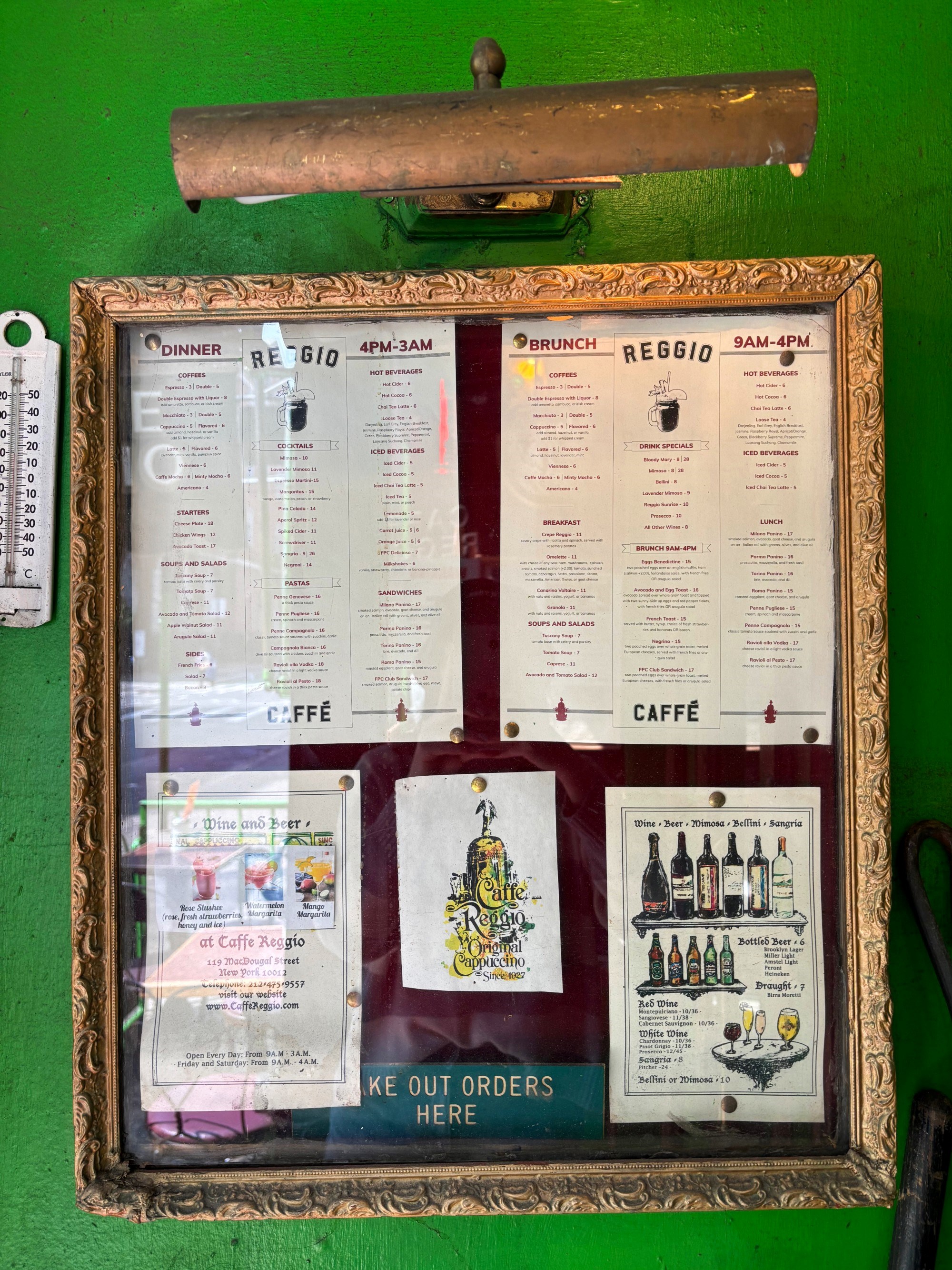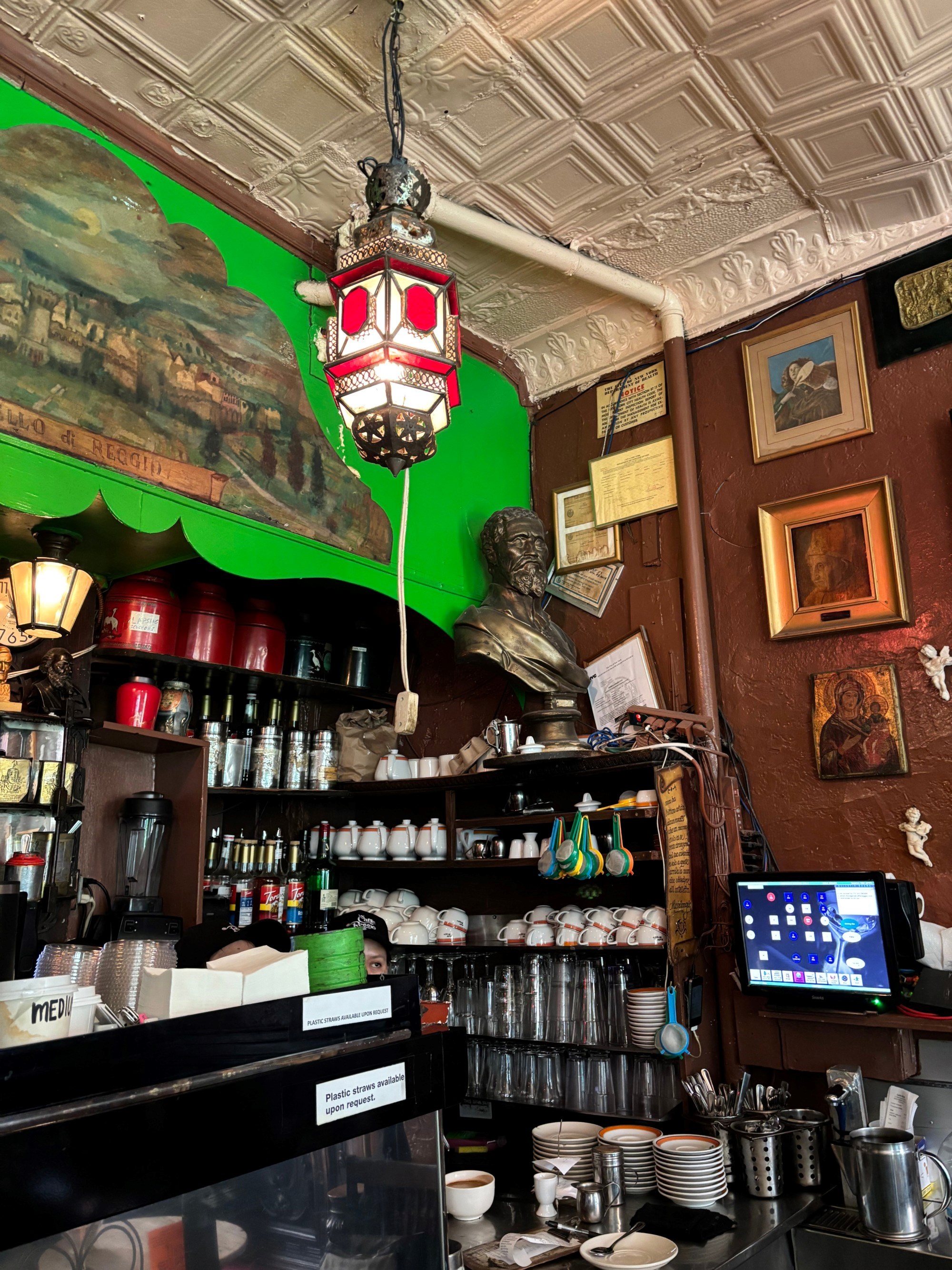 Vratimo se na Caffe Reggio, koji u šetnji ovim dijelom Greenwich Villagea zaista ne možete ne primijetiti - pročelje je jarko zeleno, pomalo teatralno, a izlog pun prašnjavnih antikviteta koji djeluju kao da nisu taknuti barem jedno desetljeće. Otvoren je 1927. godine, a zbog zelene boje, na prvu je lako zamijeniti ga i za kakav rustikalni irski pub.