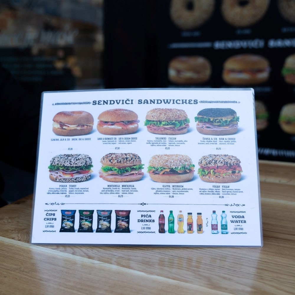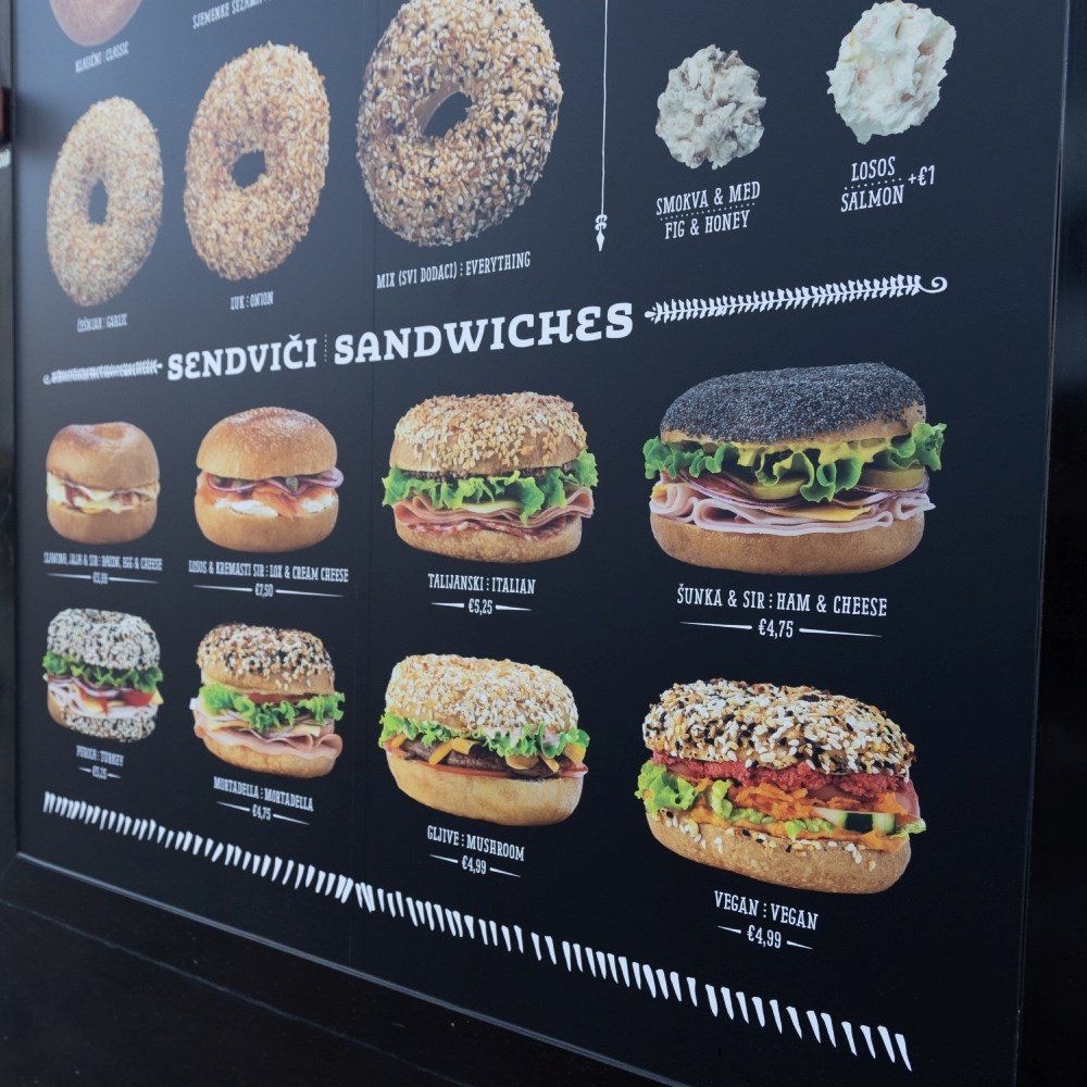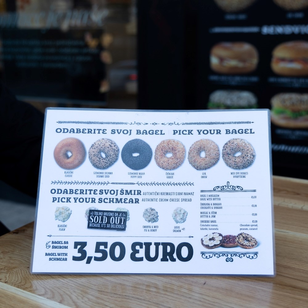 Cijene sendviča kreću se od 4.75 do 7.50, koliko košta onaj najskuplji, s lososom, a odabrati možete i običan bagel sa šmirom, autentičnim kremastim sirnim namazom, koji košta 3.50 eura. Tu možete birati između klasičnog i veganskog namaza te onog s mladim lukom, sa smokvom i medom ili s lososom, a od bagel peciva možete odabrati klasično, sa sezamom, makom, češnjakom ili lukom.