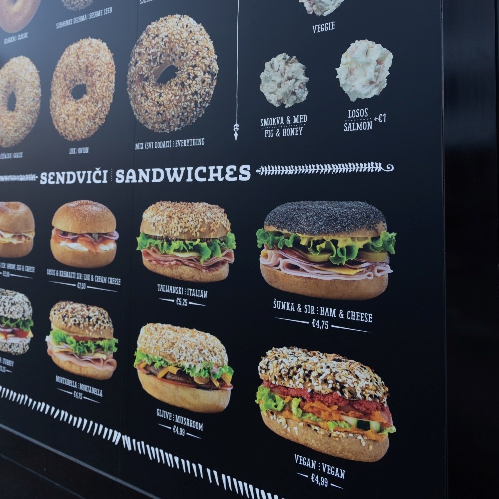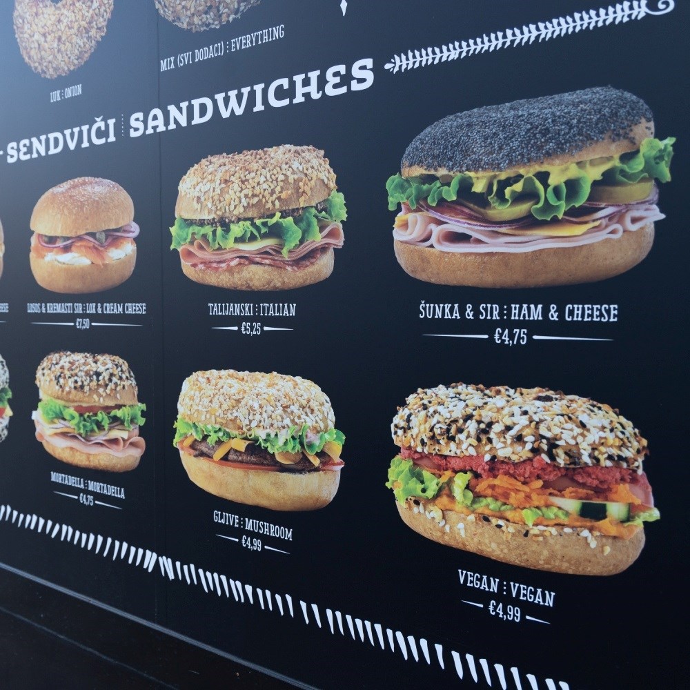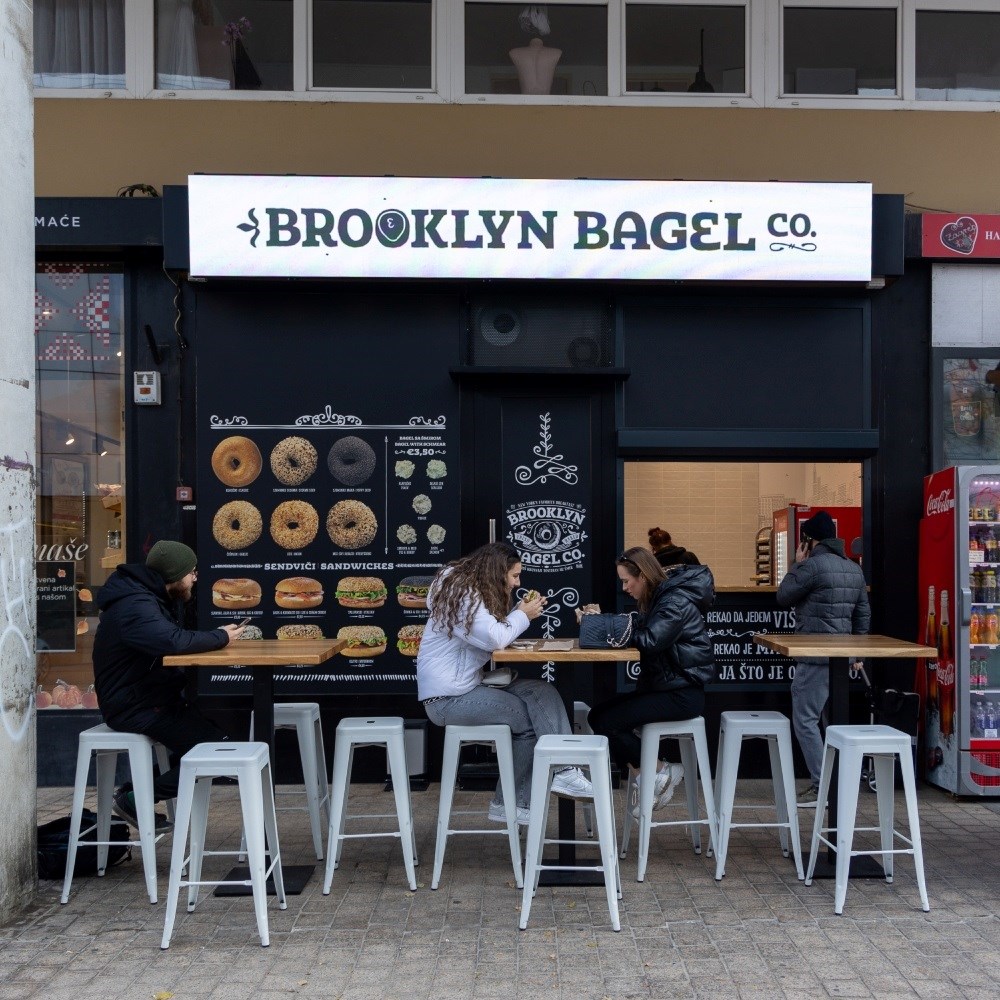 Svaki bagel u Brooklyn Bagel Co. lokalu svježe je napravljen, a u ponudi imaju osam sendviča - sa slaninom, jajima i sirom, s lososom i krem sirom, talijanski s mortadelom i mozzarellom, sa šunkom i sirom, s purećom salamom, s mortadelom, s gljivama, ali i onaj veganski.