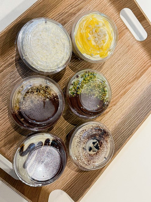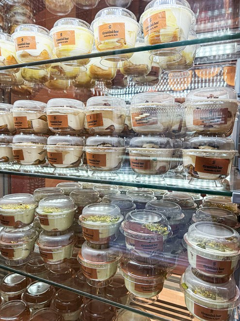 Slastice se poslužuju u elegantnim, praktičnim čašicama za ponijeti. Osim klasičnog tiramisua s mascarponeom i kavom, u ponudi su i verzije s pistacijom, karamelom, Kinder Buenom i Raffaellom. Ljubiteljima voćnih i bezalkoholnih okusa nude se varijante s limunom i jagodom, a cijena svake iznosi 5 eura.