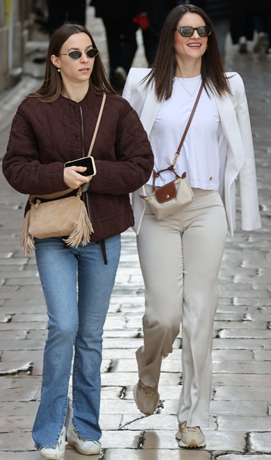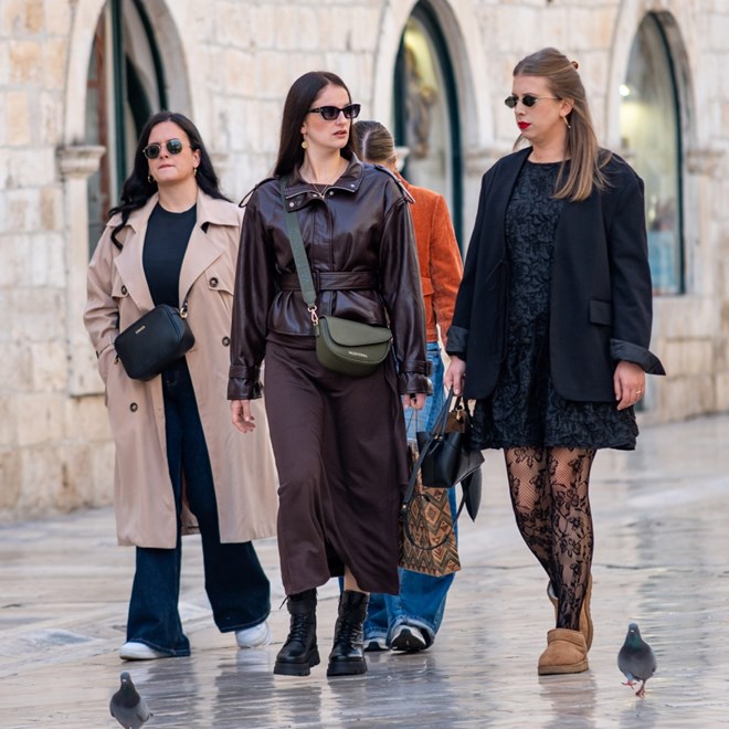 U stopu s bojama išla je i obuća. Tenisice, uglavnom bijele ili retro modeli, bile su izbor većine, dok su druge dame šetale u visokim crnim čizmama ili praktičnim gležnjačama. Male crossbody torbice u bež, bordo ili smeđoj boji zaokružile su kombinacije, dajući im dozu urbanog šarma bez pretjerivanja.
