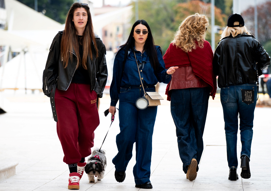 Današnji dan obilježio je traper u svim mogućim izdanjima. Široke „baggy“ hlače, tamnoplavi denim kompleti i poderane traperice nosile su se podjednako među mlađom i starijom ekipom. Traper je bio temelj, a na njega su se slagali različiti slojevi: kožne jakne u klasičnoj crnoj ili toploj smeđoj boji, oversized blejzeri te puf jakne koje su osiguravale udobnost i toplinu.